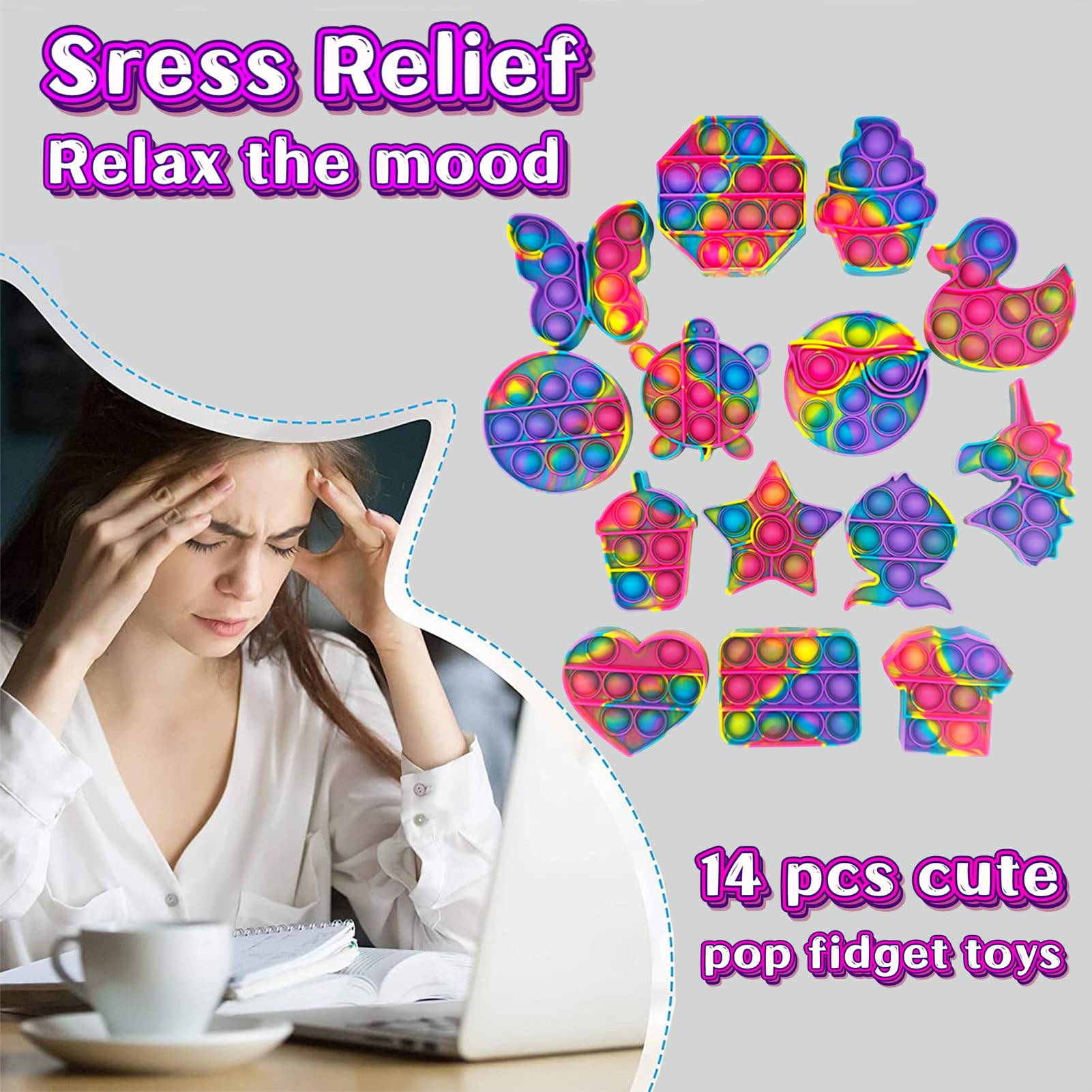 • 14pcs Fidget Toys Bulk:These fidget toys include unicorn, duck, tortoise, cat, butterfly, fish, heart, octagon, circle, rectangle, five-pointed star, ice cream, drink, clothes.Unique and diverse shapes stimulate children's imagination and creativity