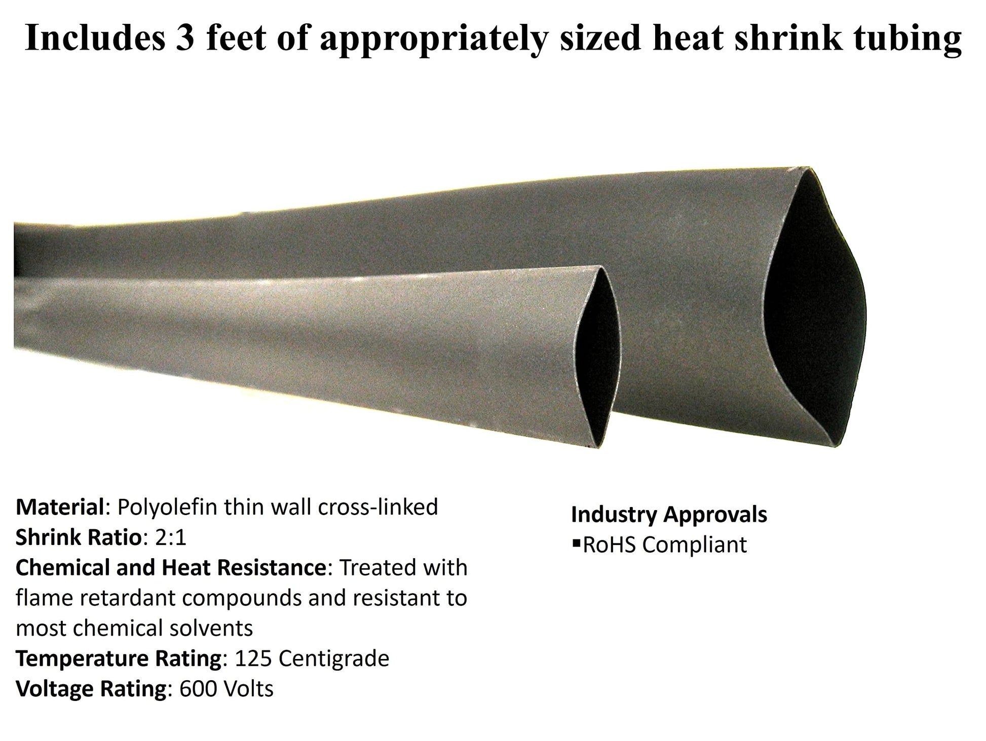 • Heat Shrink Tubing: 600 volts maximum, temperature range -55 Celsius to +125 Celsius, resistant to most solvents and fire resistant (polyolefin material), black in color with no printing. REFER TO PHOTO GALLERY FOR A DETAILED SPECIFICATION CHART.