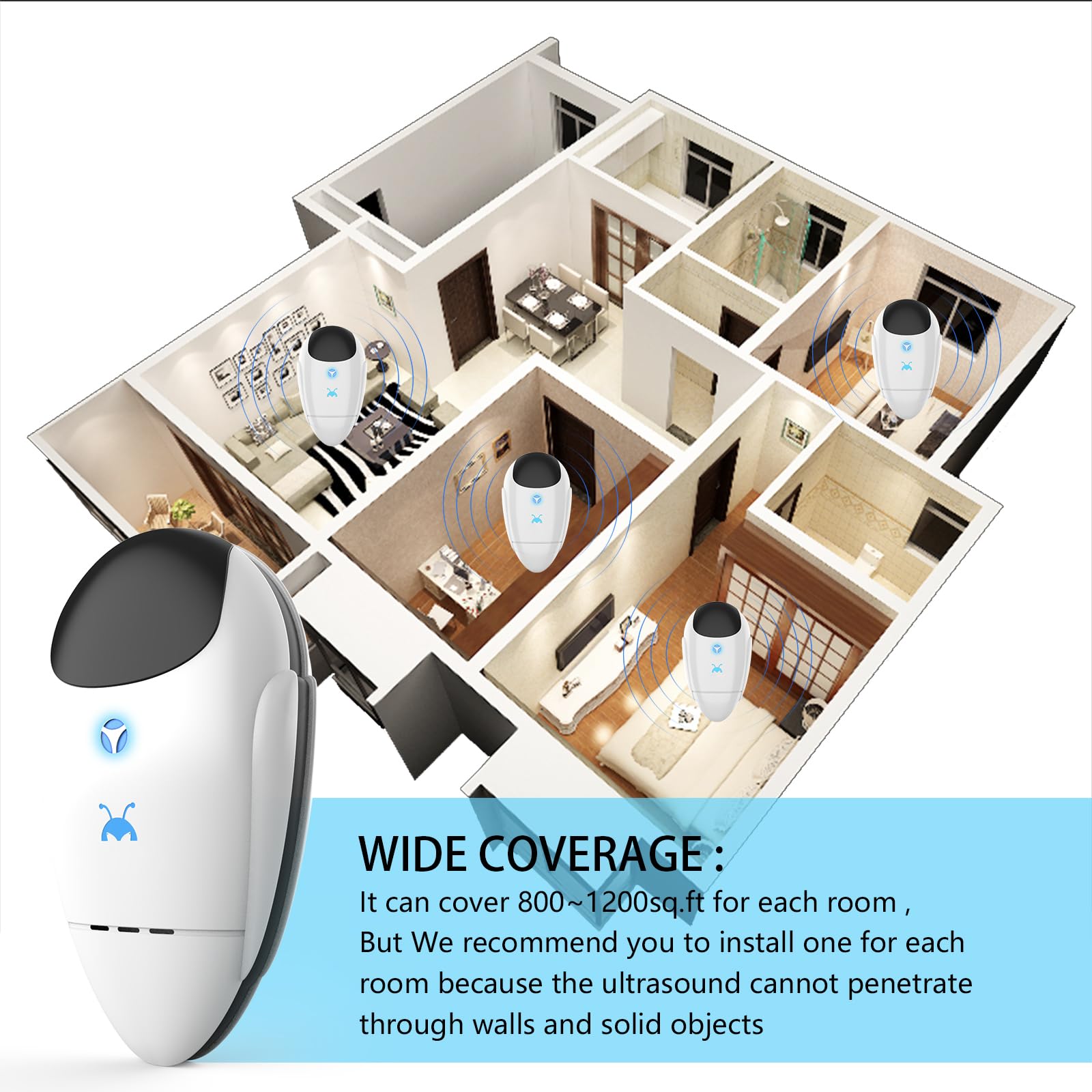• Wide Coverage Area: Effective in areas up to 800-1200 square feet, this device works best in open spaces. For optimal results, use one unit per room, as ultrasonic waves do not penetrate walls.