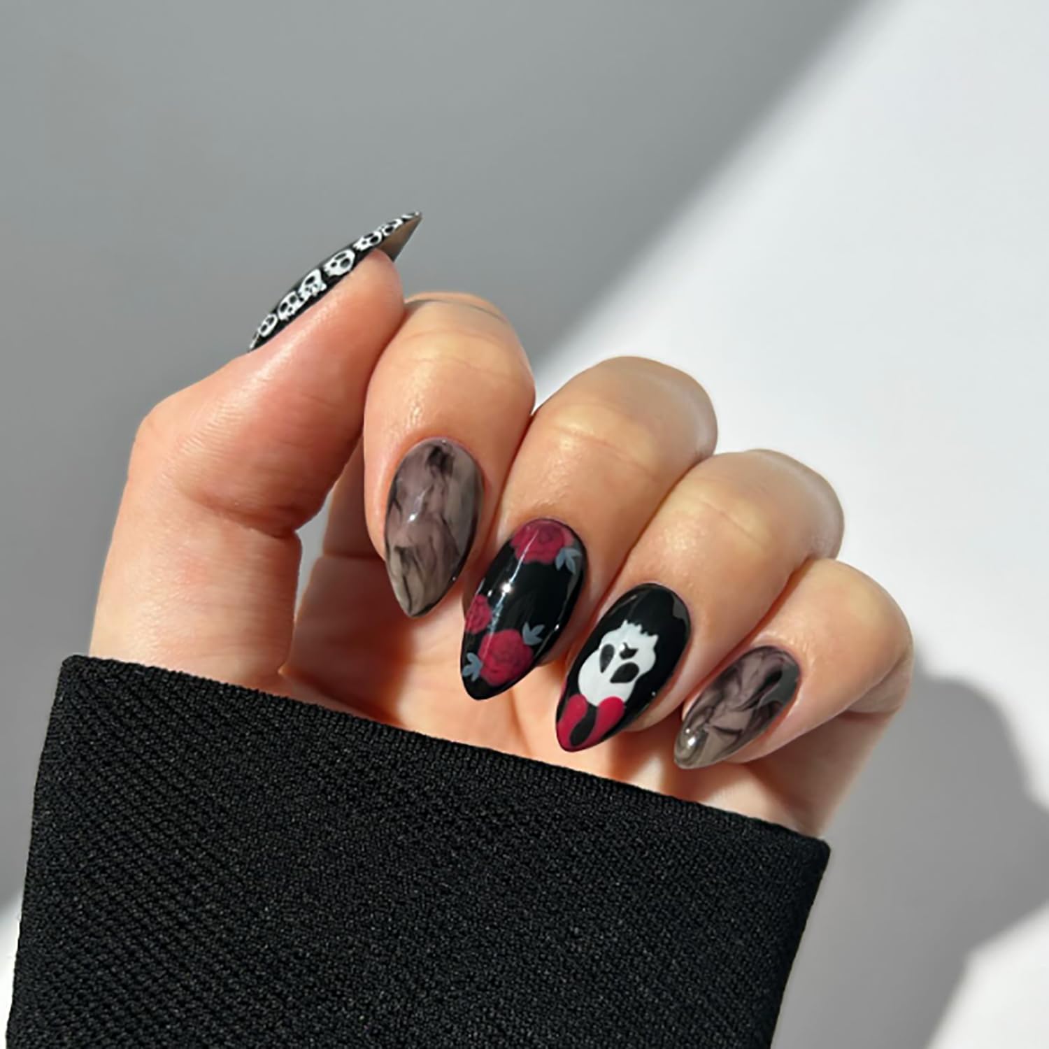 24 Pcs Black Nails Halloween Press on Nails Medium Length Fake Nails Almond RIICFDD False Nails with Red Rose and Skull Pattern Design Full Cover Horror Stick on Nails for Women and Girls