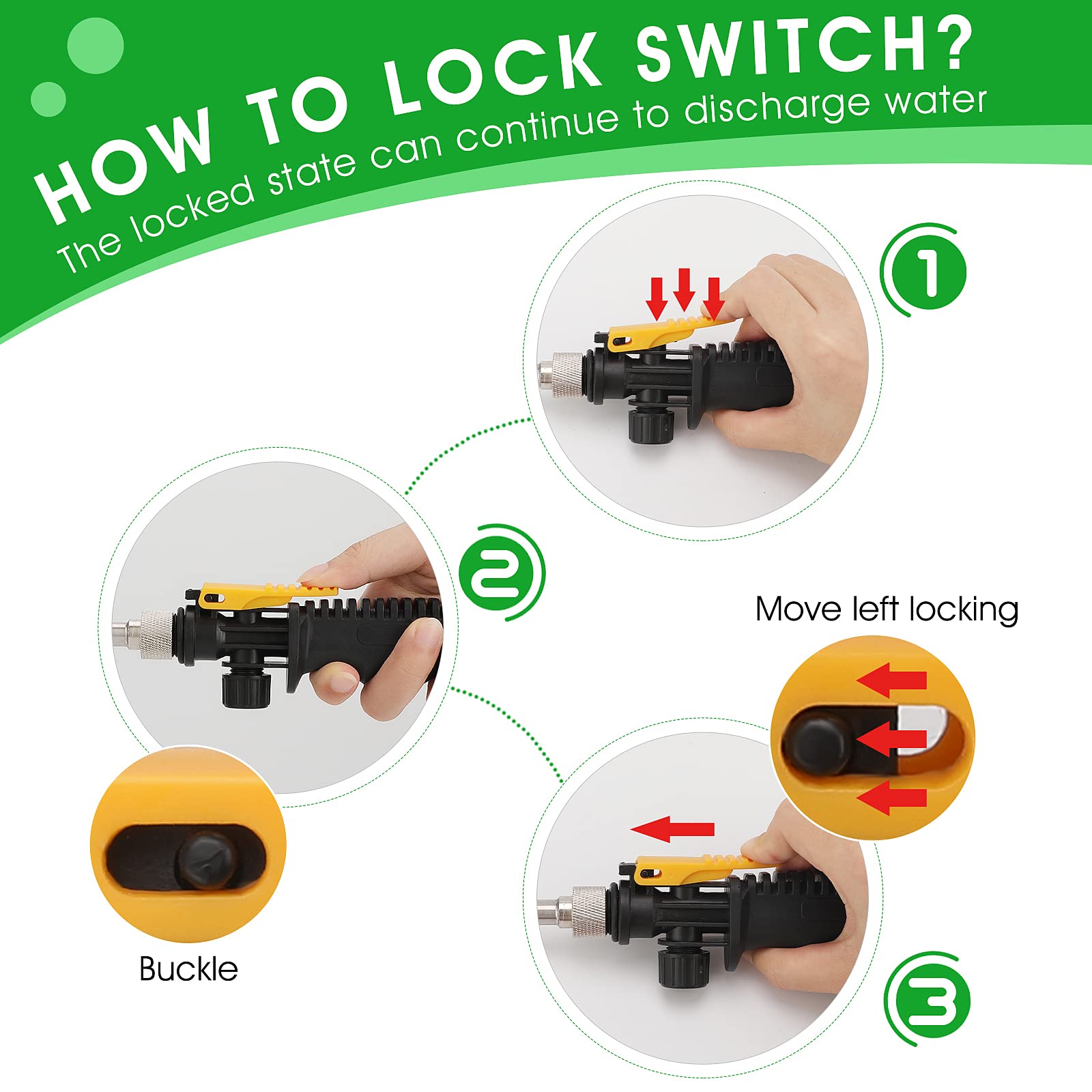 • [Lock Handle]: The handle of the spray wand for tank sprayer is designed with a locking function. When the locking function is used, the nozzle will continue to discharge water according to the set shape. We only need to move the spray wand to irrigate or clean different areas, no need to press the handle continuously, which means it can reduce the burden on hands.