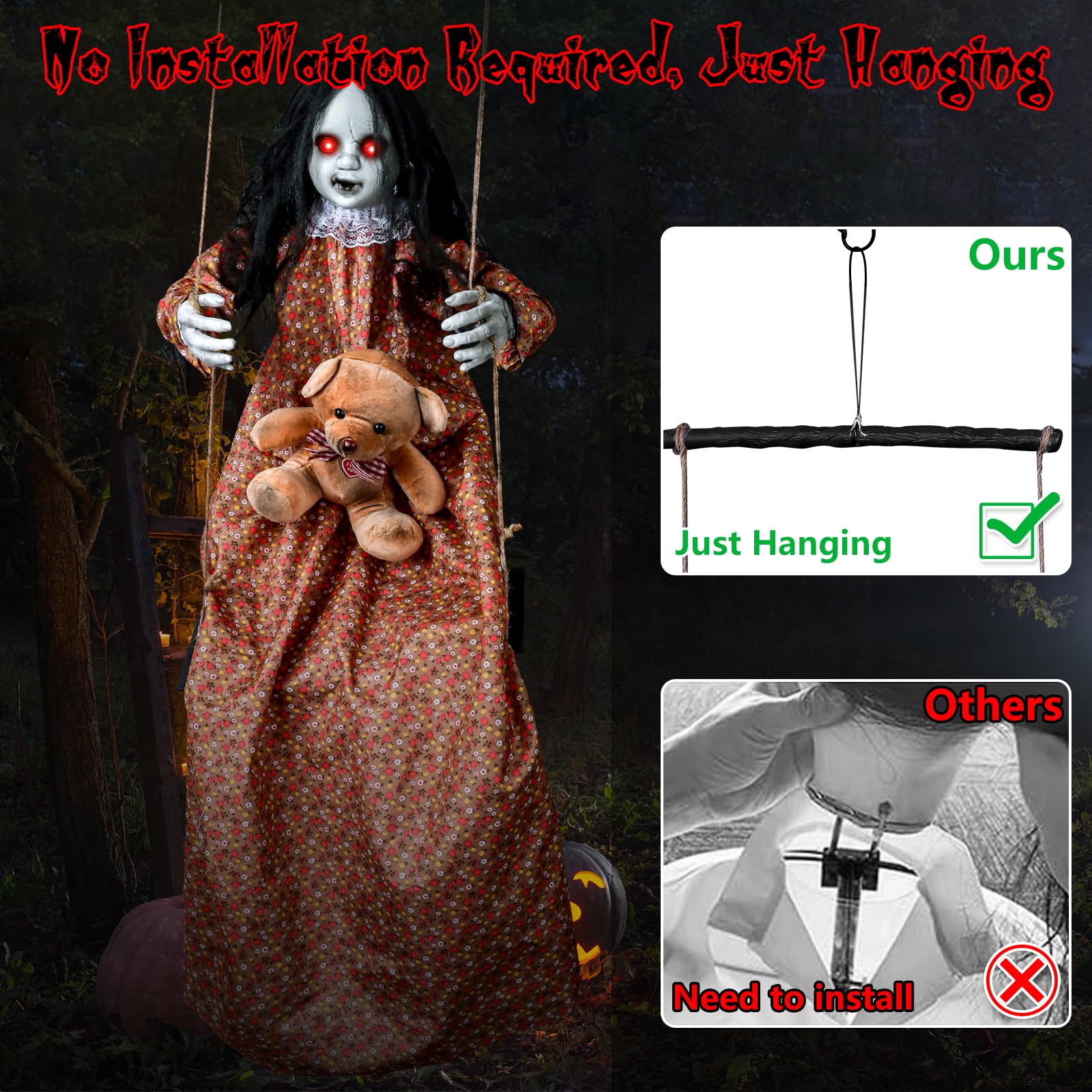 3.75 Ft Halloween Decorations Animatronics Hanging Swinging Girl with Creepy Sound/Light Up Eyes/Scary Expression, Creepy Doll Hanging Ghosts Haunted House Holiday Decor Prop for Indoor Outdoor