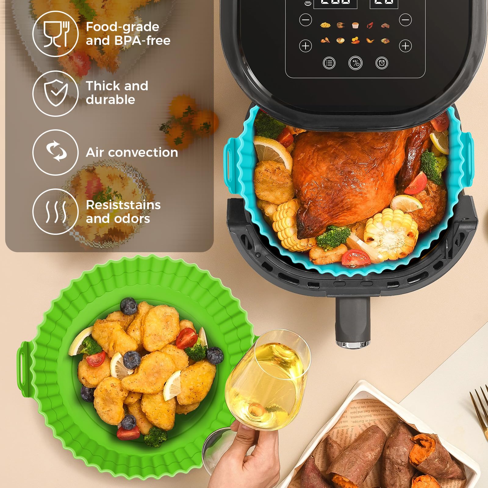 Details: Our reusable air fryer liners are made from high quality silicone material, it is waterproof, oil proof, non-stick bottom, and the raised edge of the air fryer liner protects the sides of the air fryer from food grease Splash, saves us cleaning time tremendously.