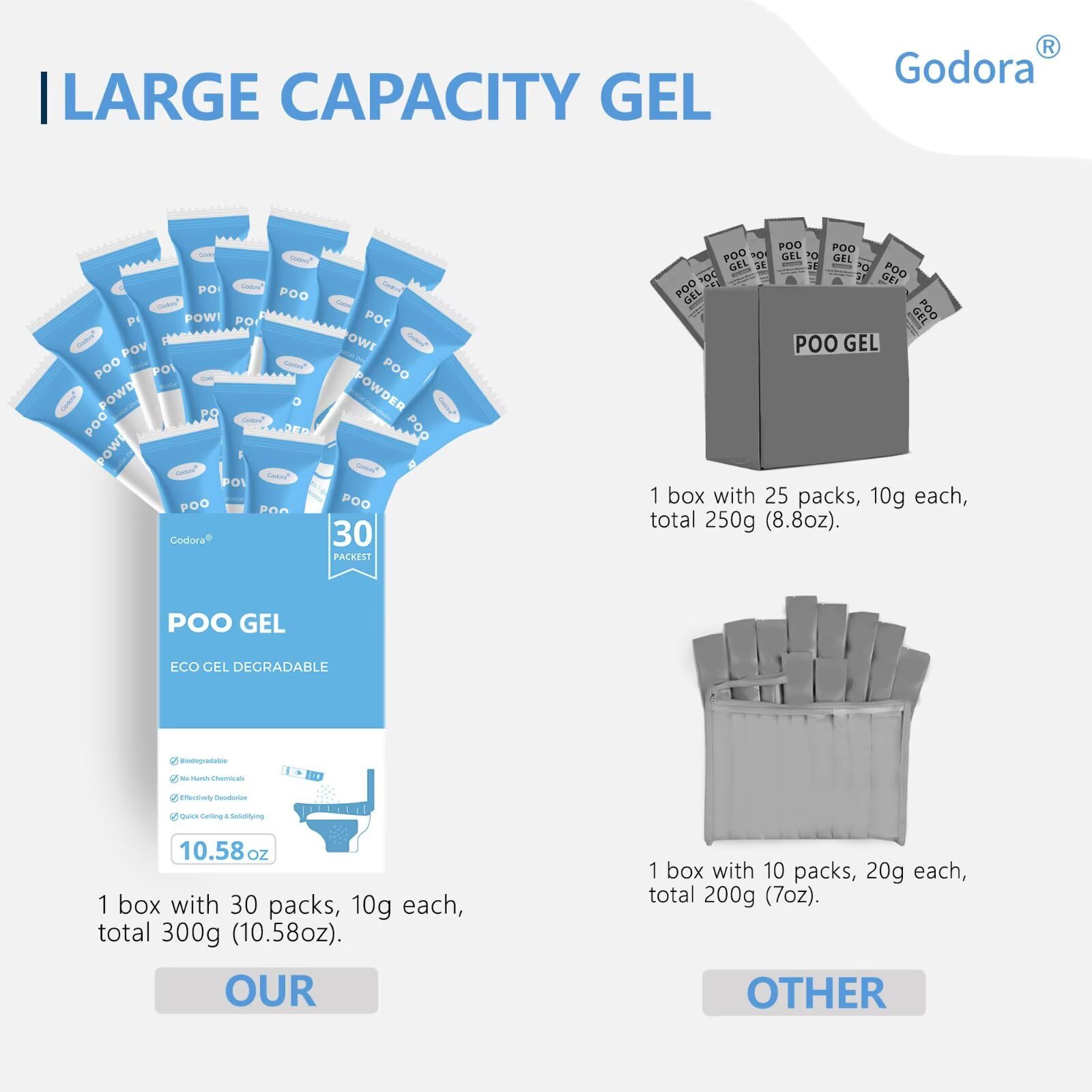 • SUPER ABSORPTION POO URINE GEL: Camping toilet chemicals contain poo urine gel 30 packs in a box, each pack poo urine gel can process 650ml/0.17 gal of urine, half a pack for adults can solve your troubles every time (concentration depends on the amount of solid gel added). Can also be used for home care, liquid waste disposal, animal care and more