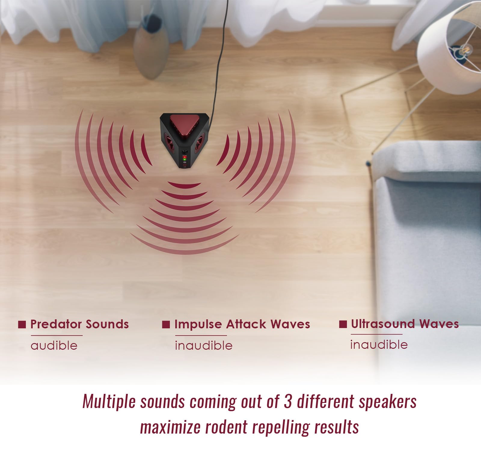 • Three Speakers with Maximum Repelling Power: Featuring three distinct speakers, this ultrasonic rodent repeller delivers a combination of high-frequency ultrasounds, impulse waves, and predator sounds, simulating natural enemies to intensify the deterrent effect against rodents.