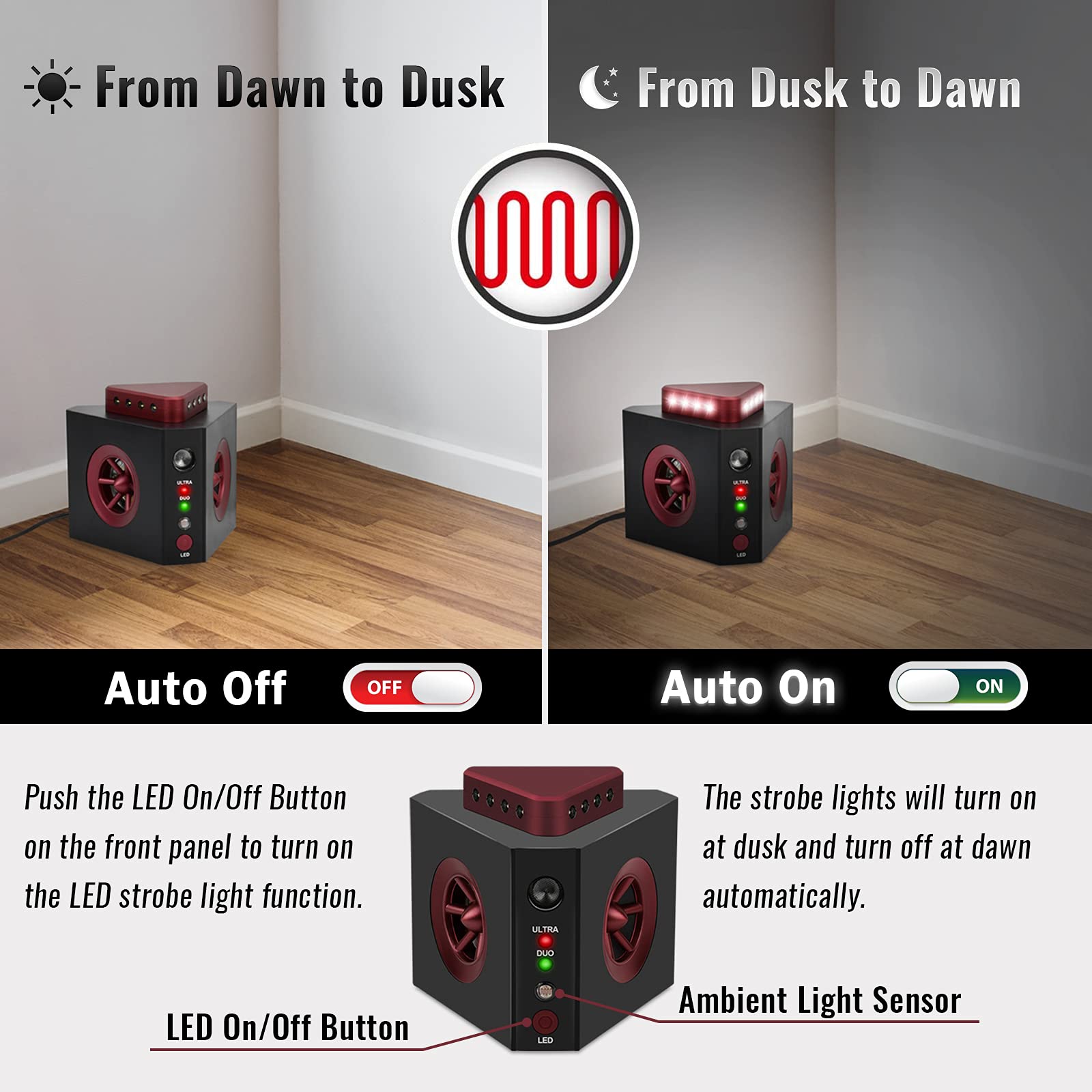 • 12 High-Intensity LED Strobe Lights with Dusk-to-Dawn Sensor: Equipped with 12 LED strobe lights, arranged in 3 groups on a triangular plate, this electronic rodent repellent target rodents' vision from all directions, using a dusk-to-dawn sensor to maximize the effect in dark environments, making it an ideal deterrent for mice, rats, and other pests.