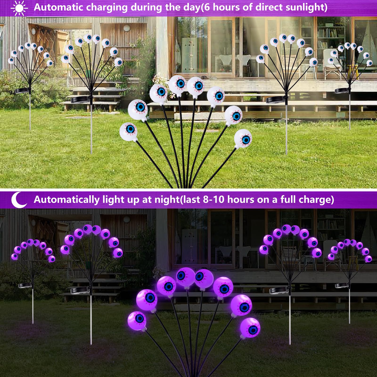 • 【Outdoor Halloween Decorations】Equipped with high-efficiency solar panel, outdoor halloween lights last 8-10 hours on a full charge, i.e. 6 hours of direct sunlight. Purple glowing eyeballs swaying in the wind provides ghostly and scary outside halloween decorations for party, camping, which is a delightful addition to outdoor halloween decor.