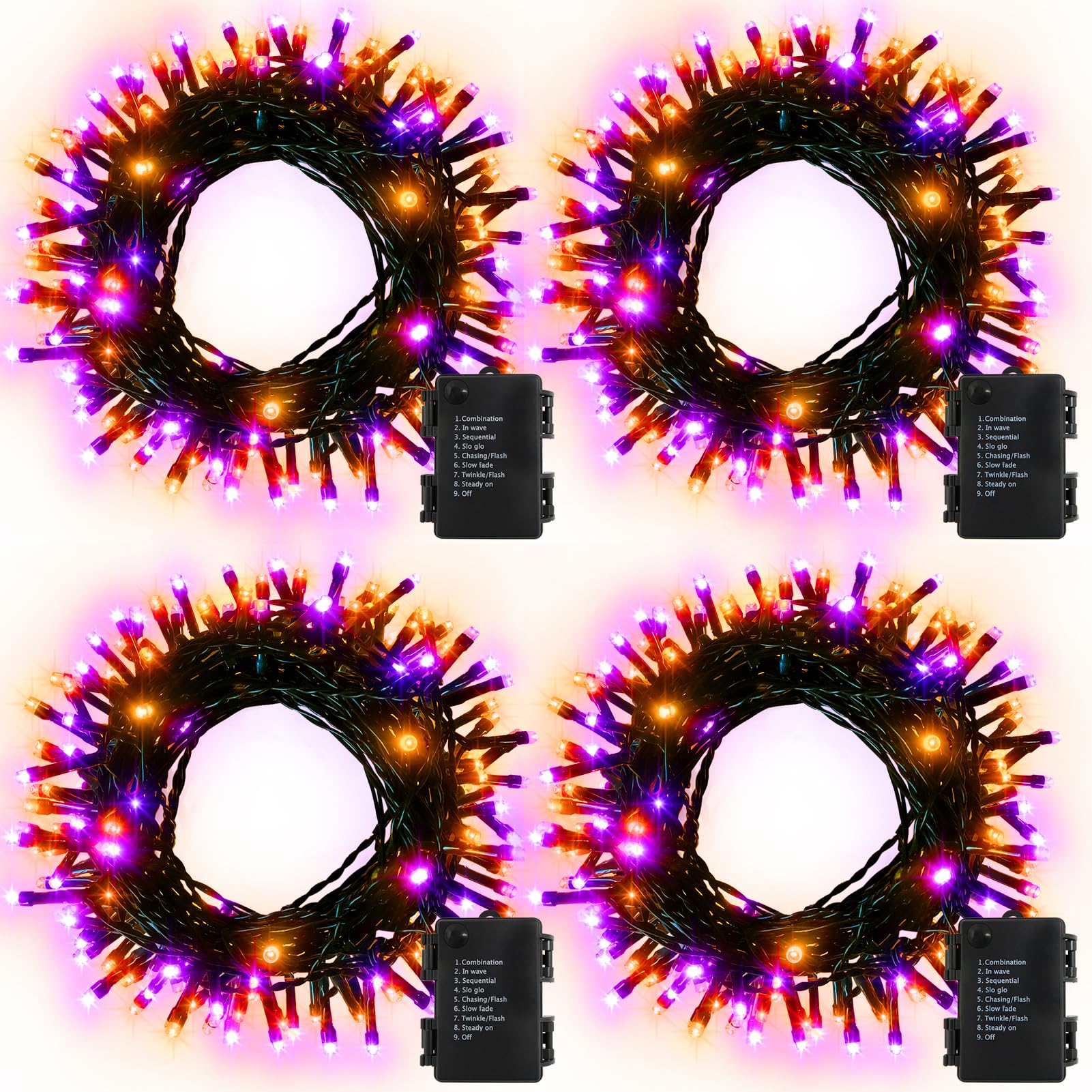 4 Pack Orange Purple Halloween String Lights Battery Operated, Each 16.4Ft 50 LED Indoor Halloween Lights with Timer 8 Modes for Party Yard Patio Decoration