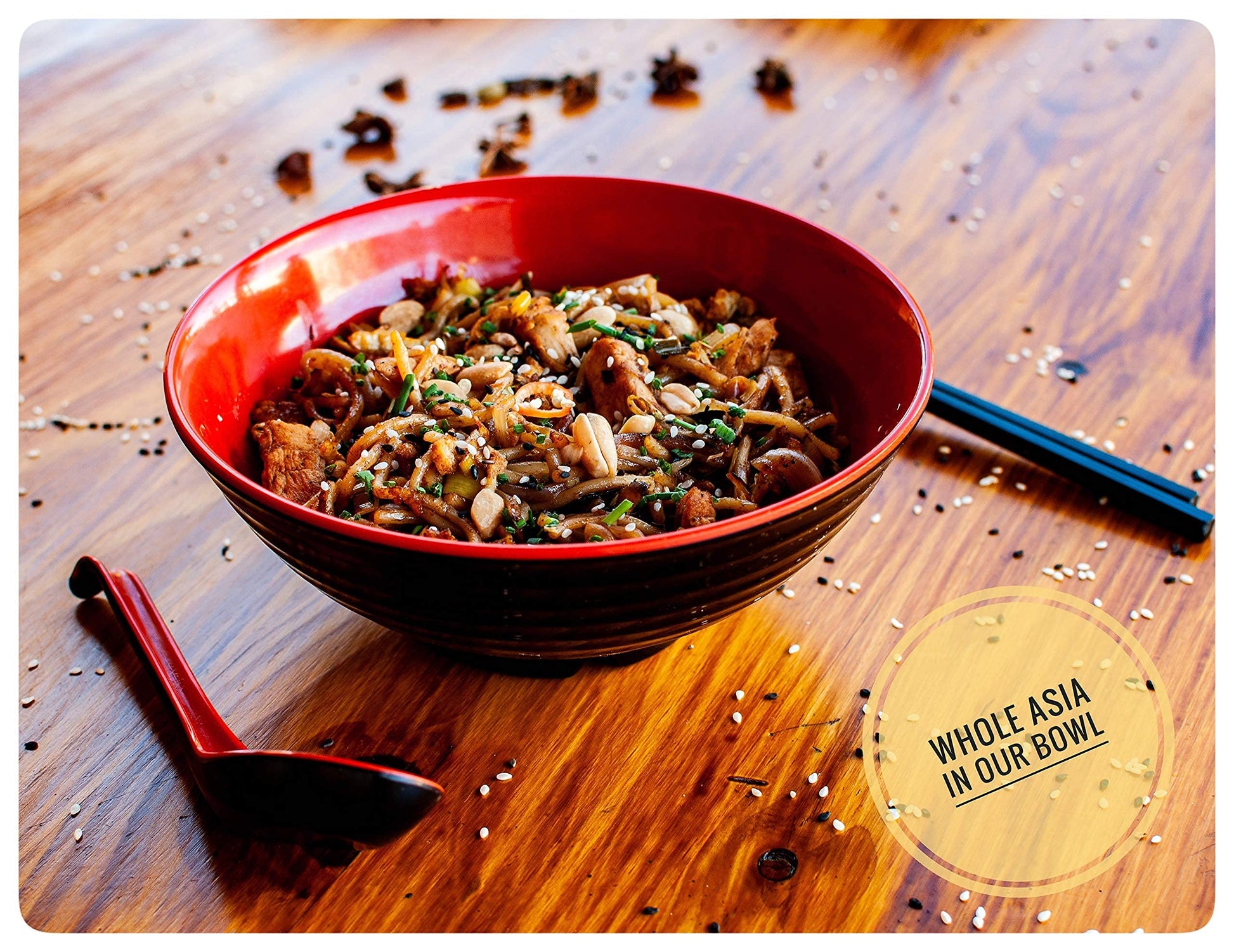 4 Ramen Bowls, 12 pieces Pho set. Red Black Ramen Bowl Set. Unbreakable Melamine. Asian Japanese soup. Spoons And Chopsticks kit. . XL 37 oz. Noodles, Rice, Udon, Thai, Chinese, Korean, Wonton, Miso