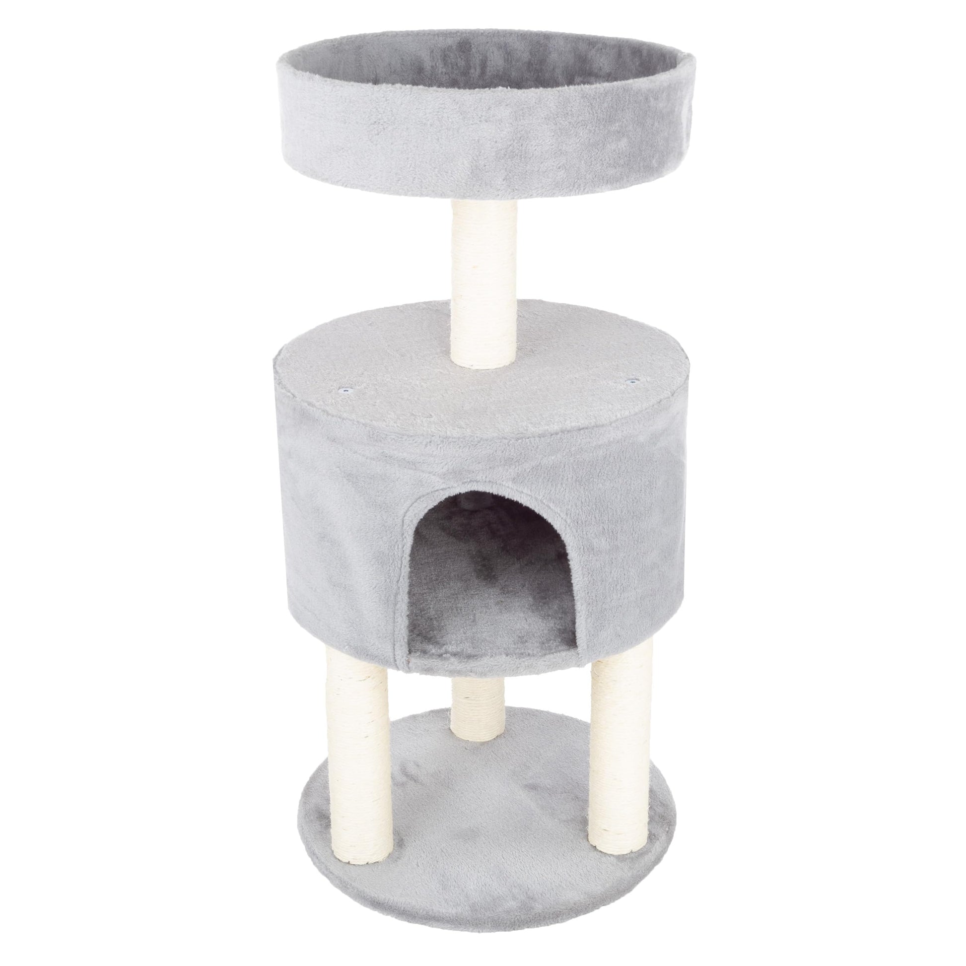 • PLUSH AND STURDY - The cat tower for indoor cats is constructed of sturdy wood and covered in a plush gray carpet. The 18-inch round base is sturdy enough to withstand vigorous play and stable for use by large adult cats or kittens.