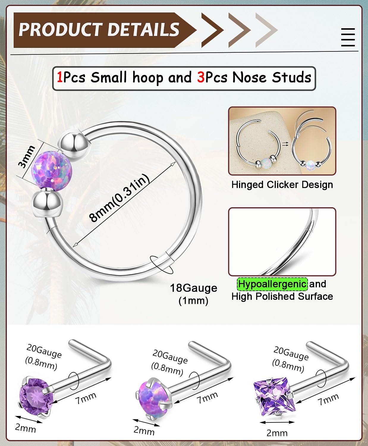 • Package Includes: 1 purple opal beaded small hoop and 3 nose studs. The perfect gift for yourself or a loved one.