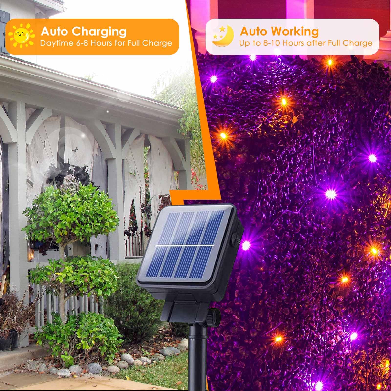 • Unique Solar Halloween String Lights: These solar string lights are made with super bright LEDs, higher solar energy conversion with upgraded solar panel. The orange and purple lighting and the black wire matches the color of your Halloween Horror party perfectly. Each set contains 4pcs of string lights, each string lights is 33ft long with 100LEDs and 4.9ft leading wire