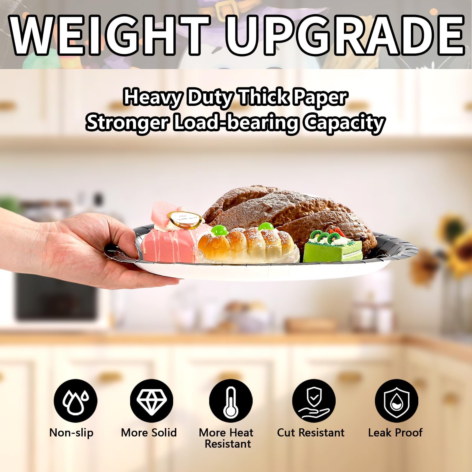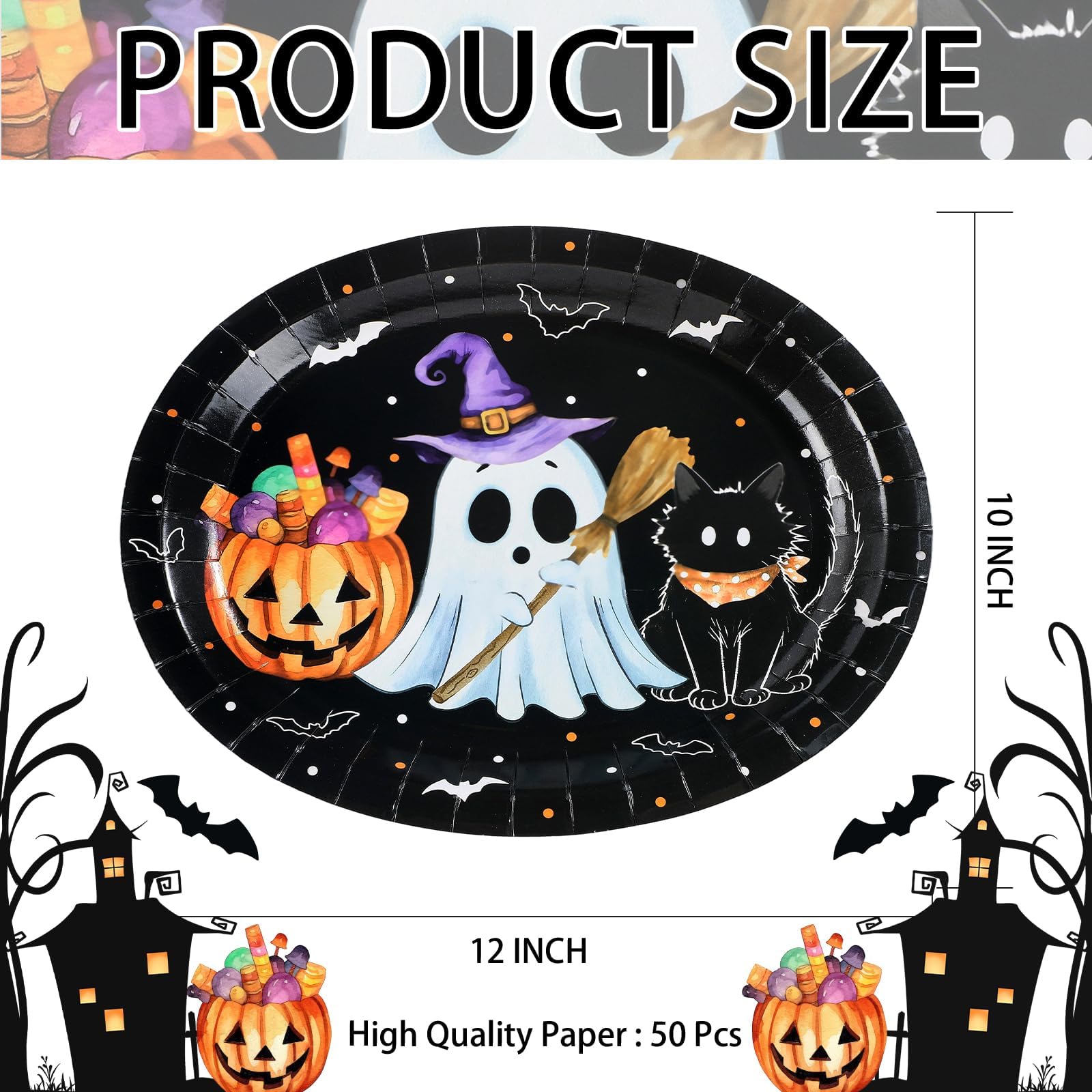 Details: 50Pcs Halloween Oval Paper Plates 10' x 12' Large Disposable Heavy Duty Cute Pumpkin Ghost Black Cat Paper Platters Jack-O-Lantern Dessert Plates for Halloween Birthday Holiday Party Supplies
