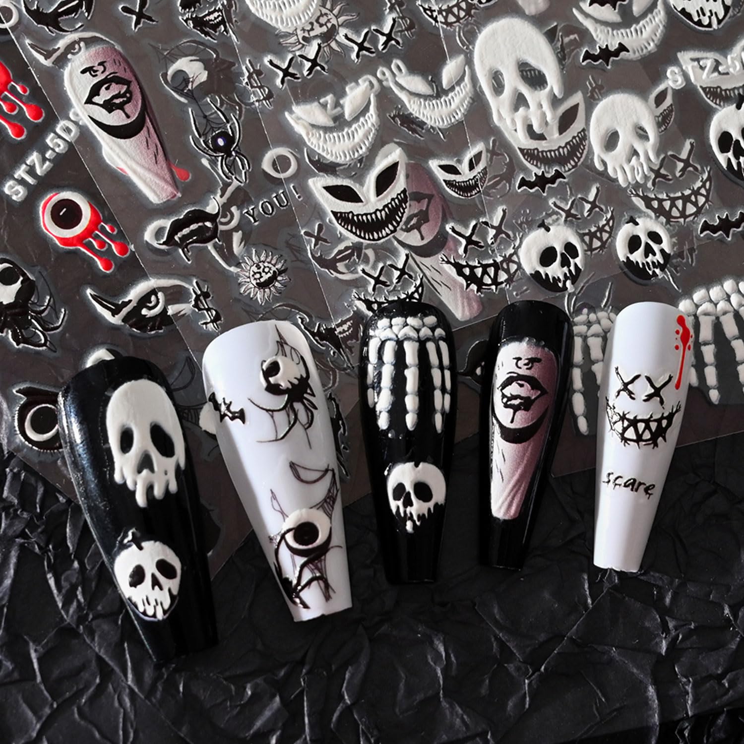 Details: 5D Embossed Halloween Nail Art Stickers Day of Death Black Lip Nail Sticker Decal Nail Art Decoration Supplies Horror Spooky Spider Evil Eye Skull Bone Halloween Self-adhesive Nail Design for Women Girls (halloween-1)