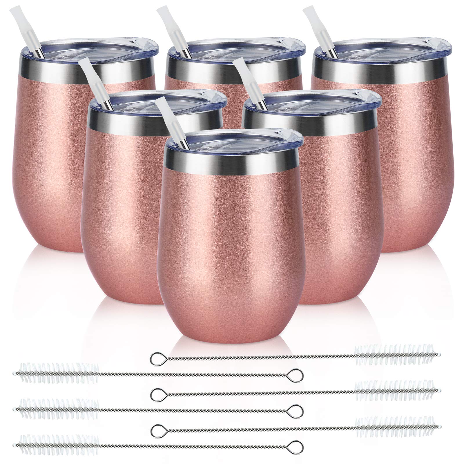 6 Pack Stainless Steel Wine Tumblers, 12Oz Insulated Wine Tumbler, Double Wall Insulated Wine Glass, Stainless Steel Stemless Wine Cups with Lids for Coffee, Wine, Cocktails, Champaign, Rose Gold…