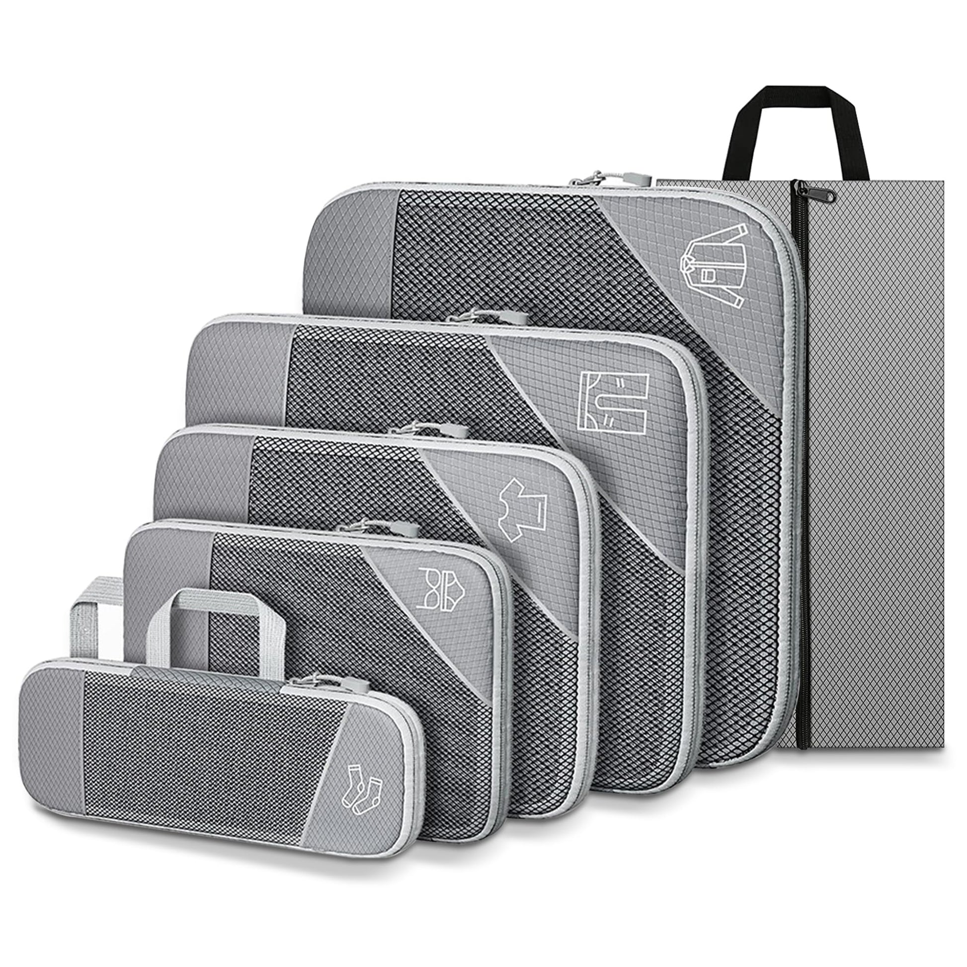 • 【Compressing Design】There Is an extra zipper outside of our compression packing cubes, be zipped up to work perfectly in compressing clothes to help save space in your travel backpack. Steps:1) fold your clothes and flatten them 2) pack clothes in cubes and zip the normal zipper. 3) Zip up the extra zipper to compress the packing cubes.