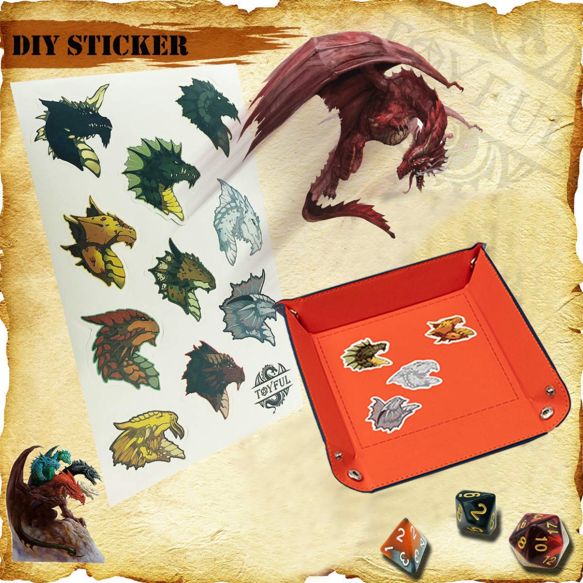 • DICE TRAY WITH DRAGON STICKER: 7 x 7 inches dice tray, easy to fold and unfold. The outside of the dice tray is made of thick PU leather and the inside is wrapped with softy PU leather. Rolling dice in style with dice tray kit. Perfect for dice games