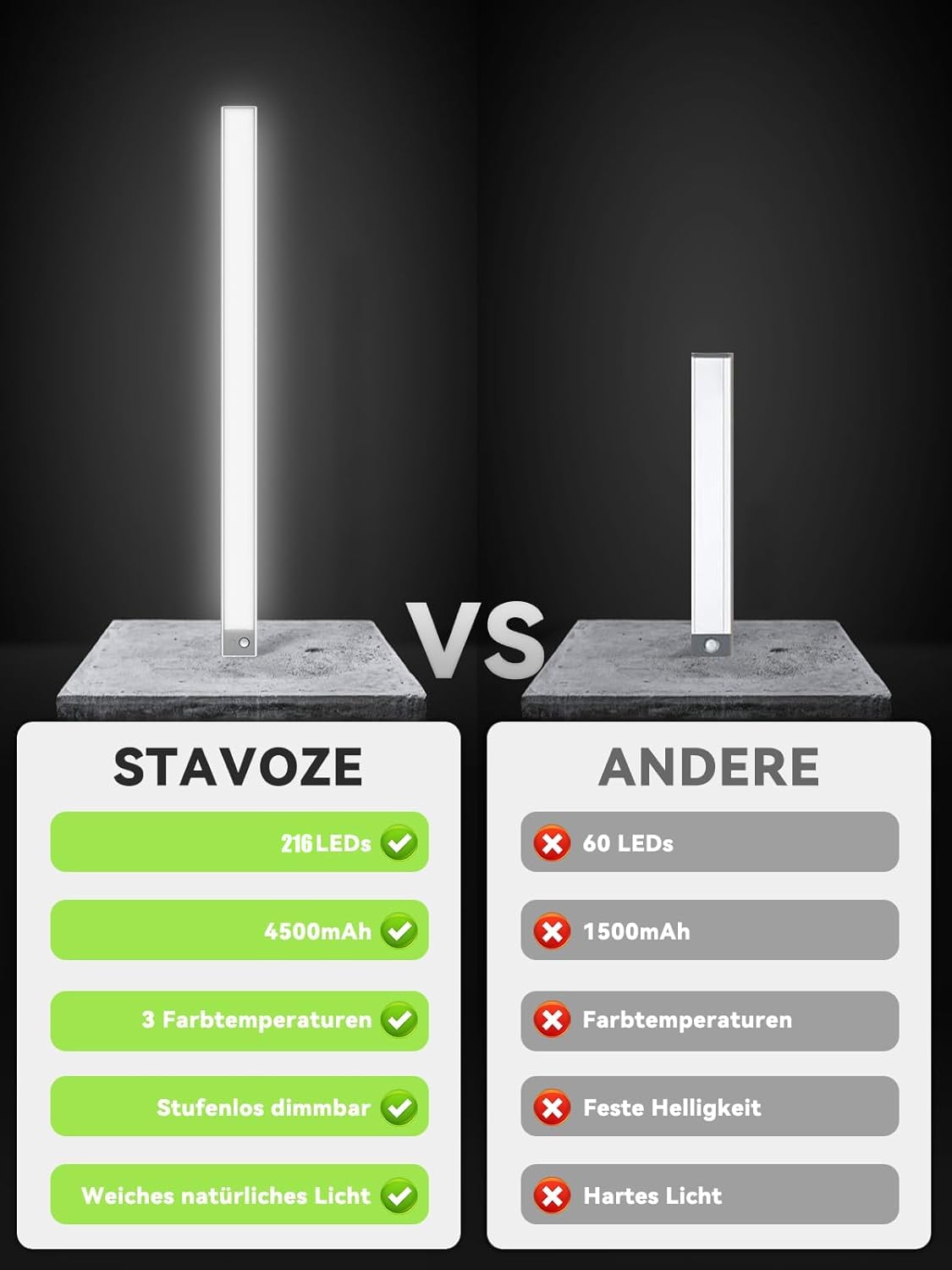The STAVOZE 60 cm under-unit kitchen light is a modern, minimalist LED light that is perfect for cupboards and other rooms under the counter. With its length of 60 cm, it offers an extended lighting area, making it ideal for kitchens and other areas where a lot of space is required. The light is equipped with a powerful 4500mAh battery that lasts up to a month in motion sensor mode and lights up for over 10 hours in continuous operation. The light offers three adjustable colour temperatures (2700 k/4000 k/6000 k) and is dimmable, so you can adjust the lighting according to your wishes. Installation is easy thanks to the magnetic design and allows you to remove the light when needed for charging or emergency. The light is not only suitable for cabinets, but also for different rooms in your home such as cabinets, staircases, bedside tables, tool rooms and more. It can even serve as temporary lighting in case of power outages or other emergency situations.