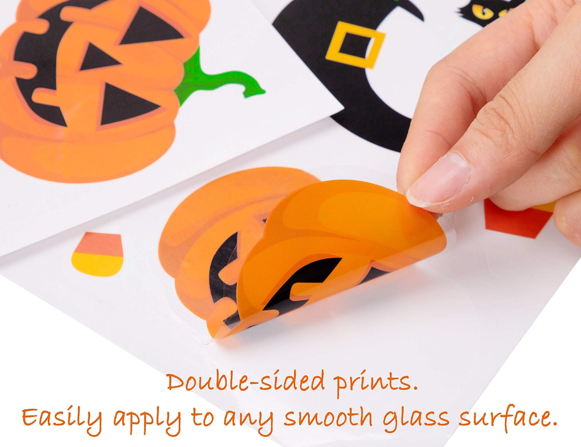 • Package Includes: 625PCS assorted Halloween window clings, 12 sheets included; They have various designs like ghost, skeleton, witches, bats, spiders, monsters, pumpkins, black cat, etc