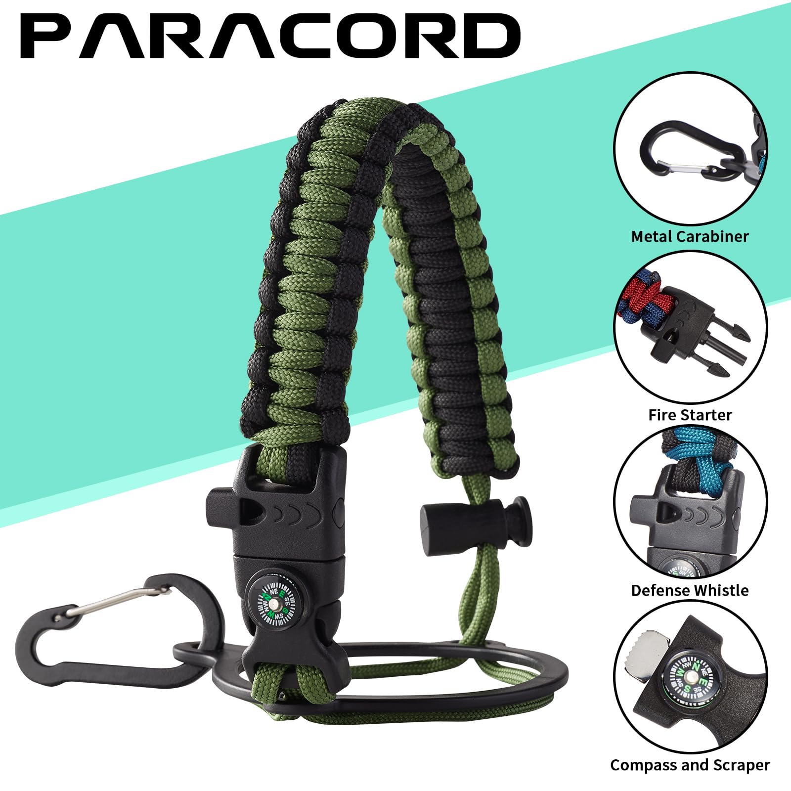 • UNIQUE DESIGNS PARACORD HANDLE: Full-function paracord handle made in individual styles to match the color of the flask water bottles. With compass, safety ring, carabiner, flint fire starter & whistle. It unravels into a sturdy and taut rope in an emergency, making the large water jug an ideal survival kit for expeditions in the wild