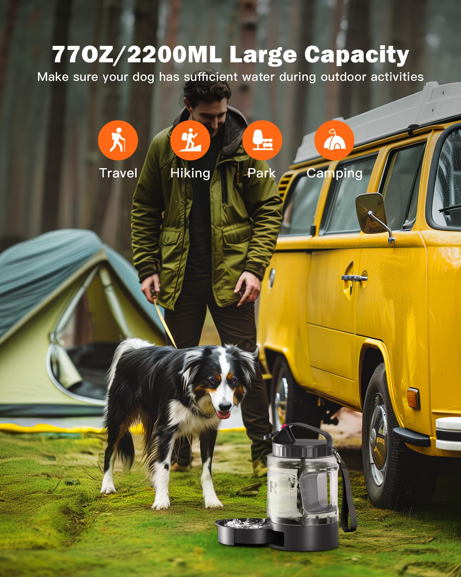 • 💯【77oz Extra-Large Capacity for Thirsty Dogs】Designed for large dogs and multi-pet families, this portable 77oz dog travel water bottle ensures your furry friend stays hydrated on long walks, hikes, camping trips, and car rides. No more worrying about running out of water—perfect for summer adventures!