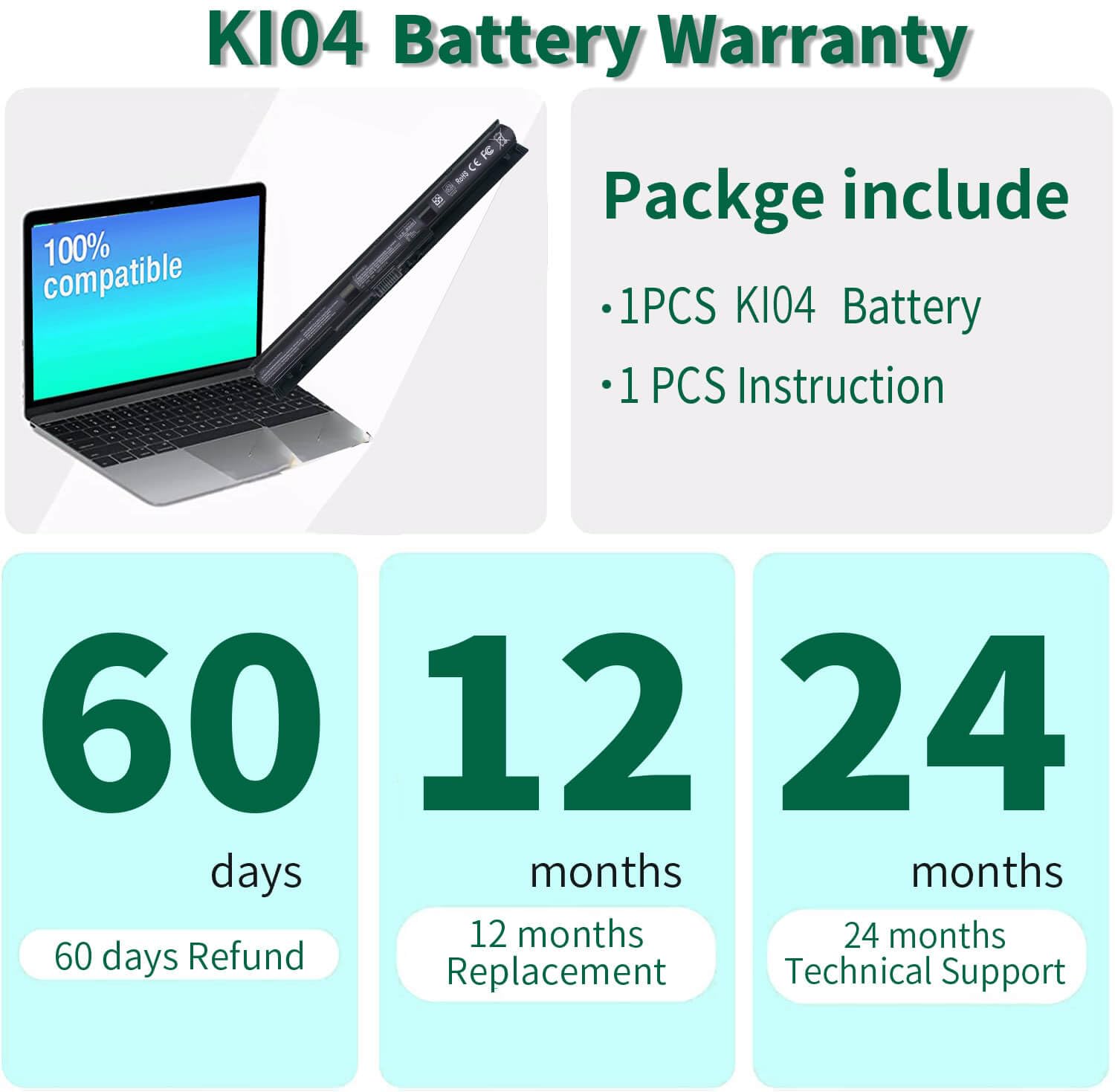 • Quality and Certification:Our KI04 Battery is highly compatible with the original 800049-001 HP Pavilion Battery and meets CE/FCC/ROHS/UL certified standards. It is a brand-new product from the manufacturer and supports up to 1000 recharge cycles.
