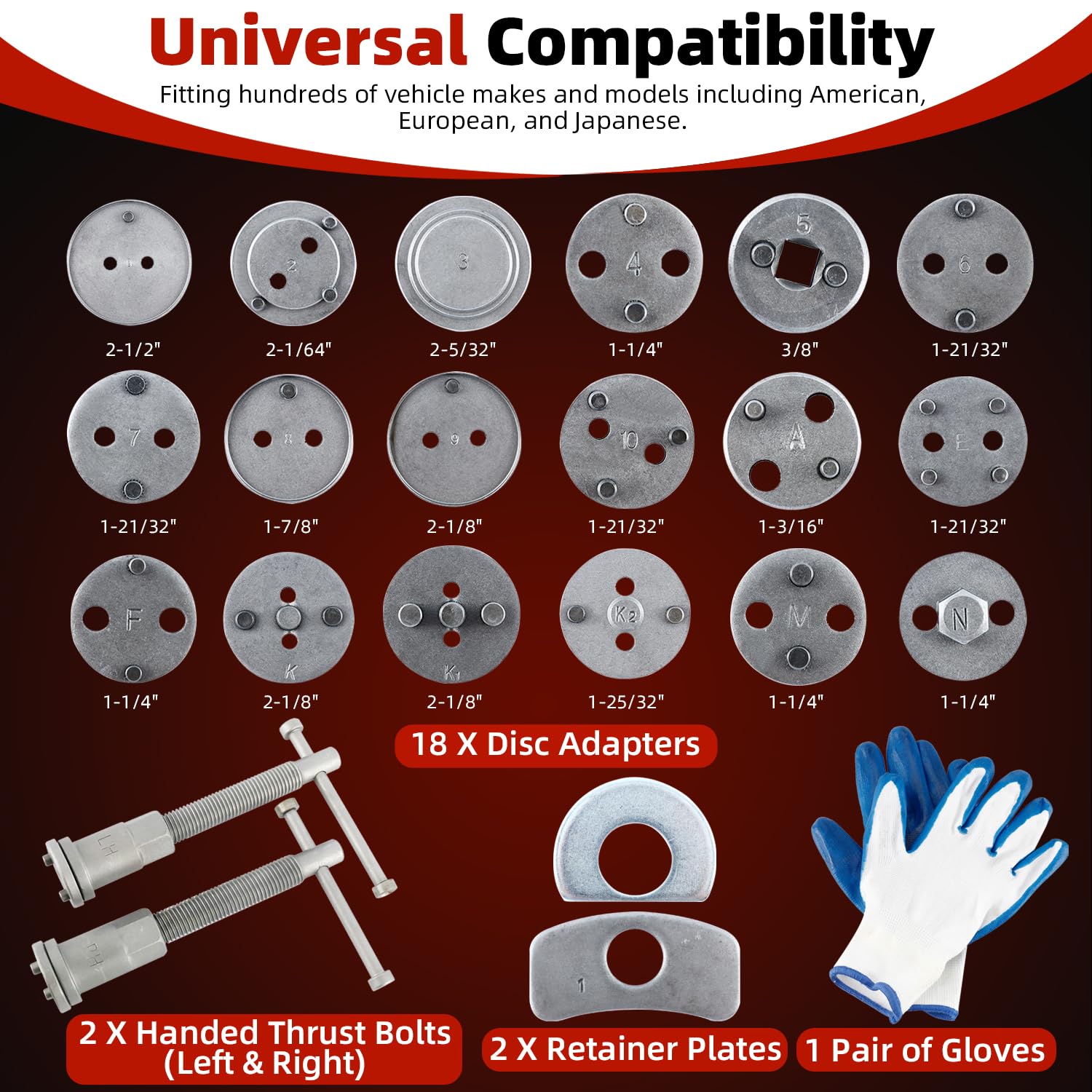 • 24Pc kits rotates piston back into caliper for fitting of new brake shoes and pads