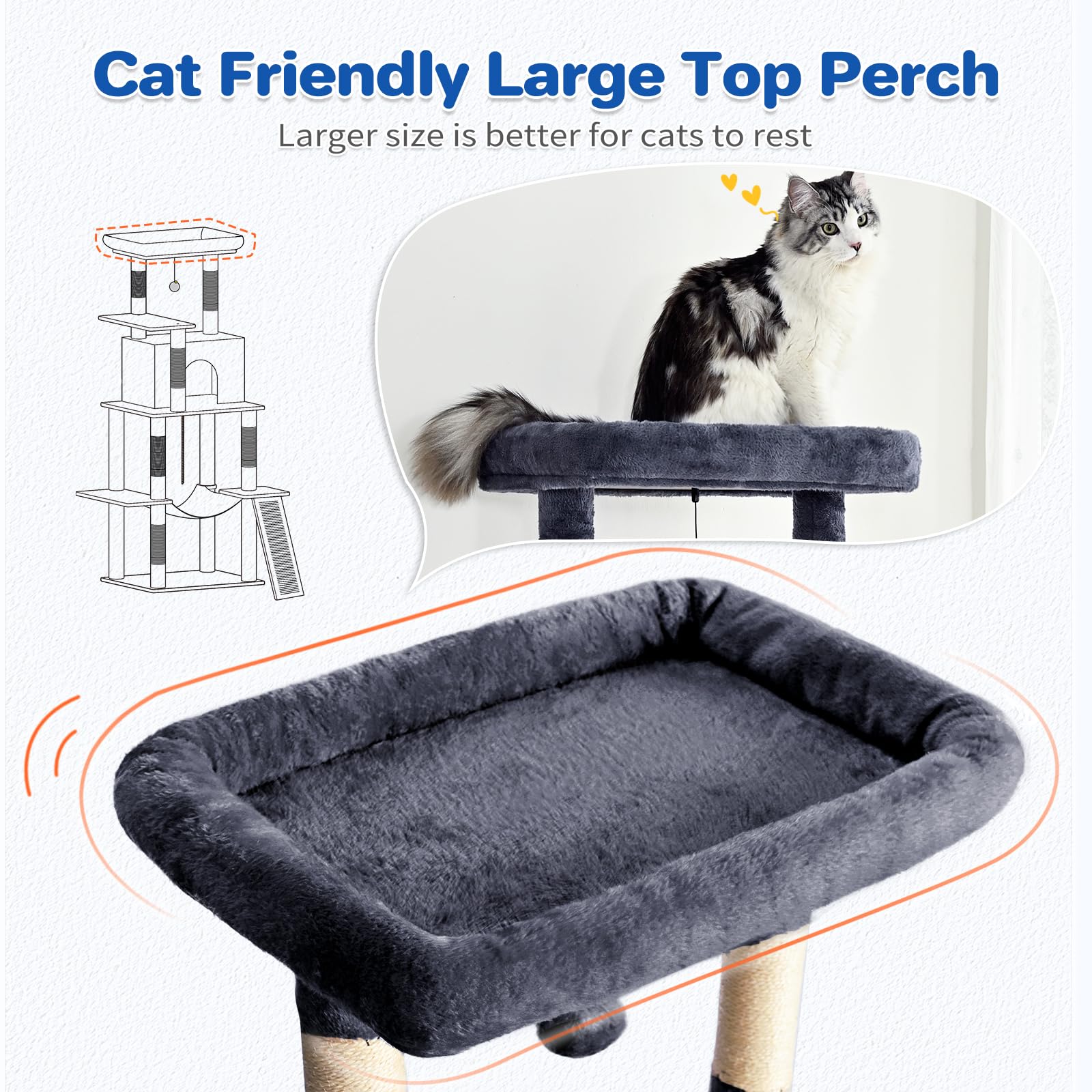 ABCPET Cat Tree Tower 63in Multi-Level Cat Tower for Indoor Cats with Sisal Scratching Posts, Condo, Hammock, Dangling Ball and Extended Platform for Cats to Play, Dark Grey