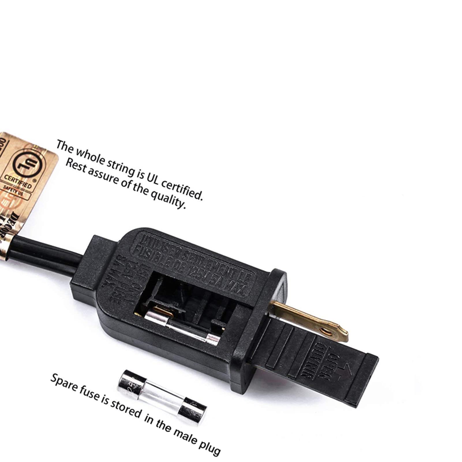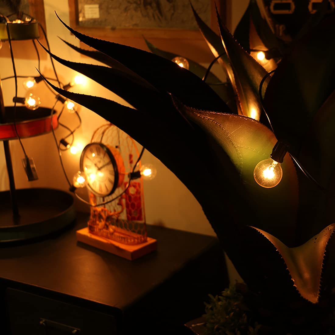 • 5 Replacement Spare Bulbs: 100ft black cable with 100 hanging sockets, 100 clear glass G40 bulbs, 5 spare bulbs, 1 instruction book, 1 spare fuse stored in the male plug, 2200k, bright enough but will not affect the indoor and outdoor ornament warm and retro ambiance