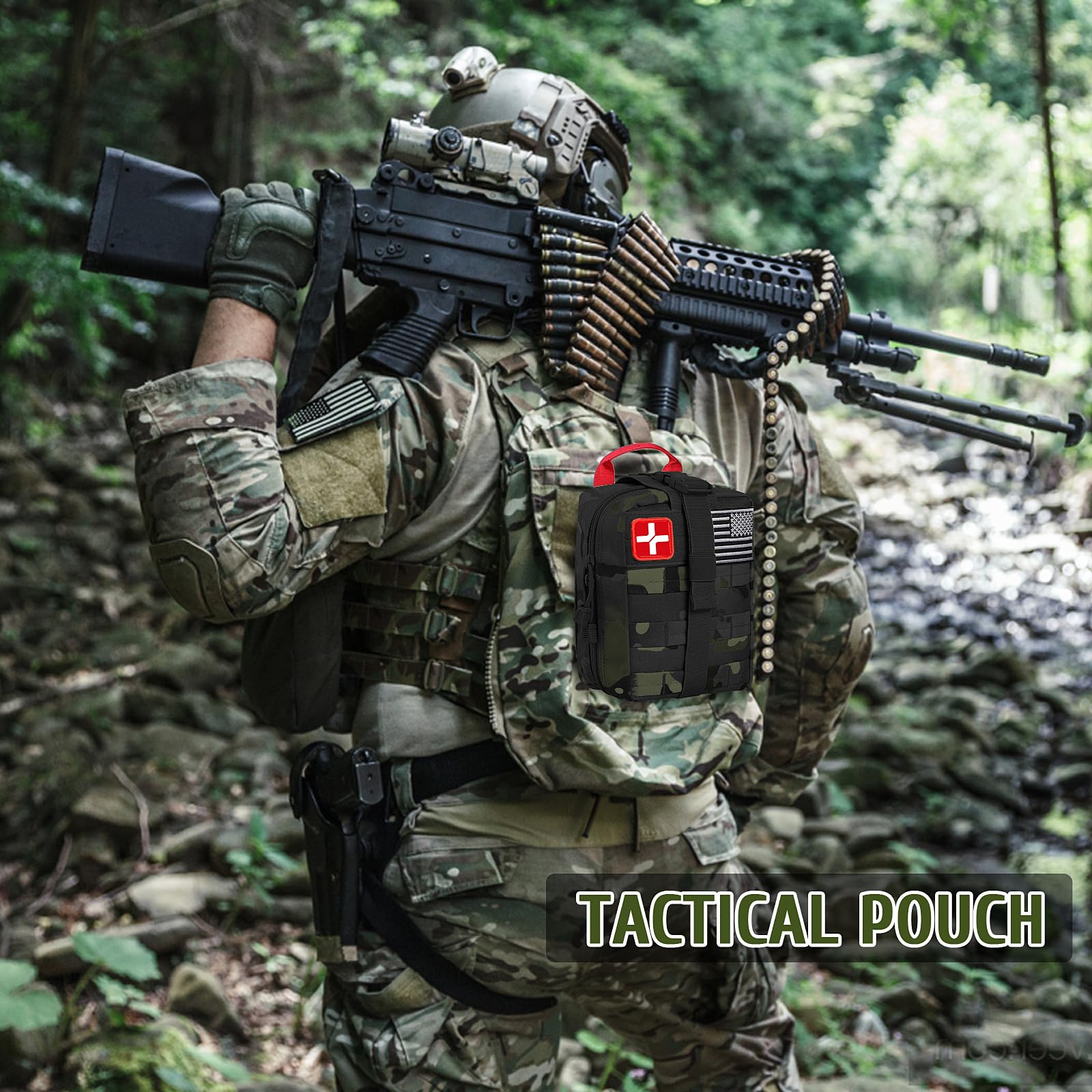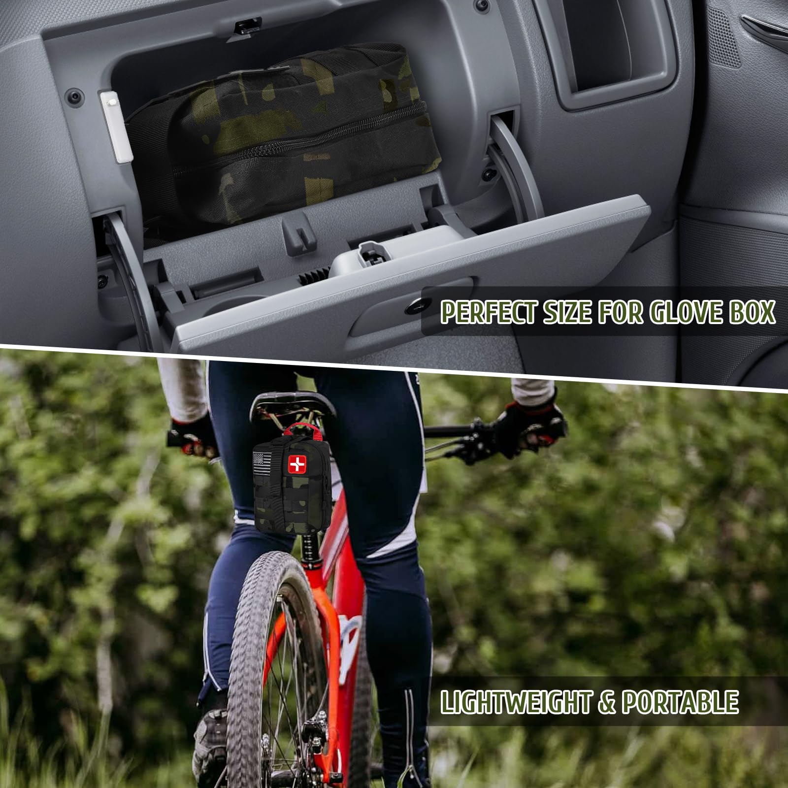 • 【Compatible and Portable】 The military grade MOLLE medical pouch is made of 1000D nylon, which is lightweight and waterproof. Inside the bag, there are three large compartments and several straps, all survival gear and equipment are stored in an organized and easy-to-find manner, making it easy to locate necessary items in an emergency situation. The MOLLE system on the back also allows you to easily attach the kit to your tactical vest, backpack, or belt.
