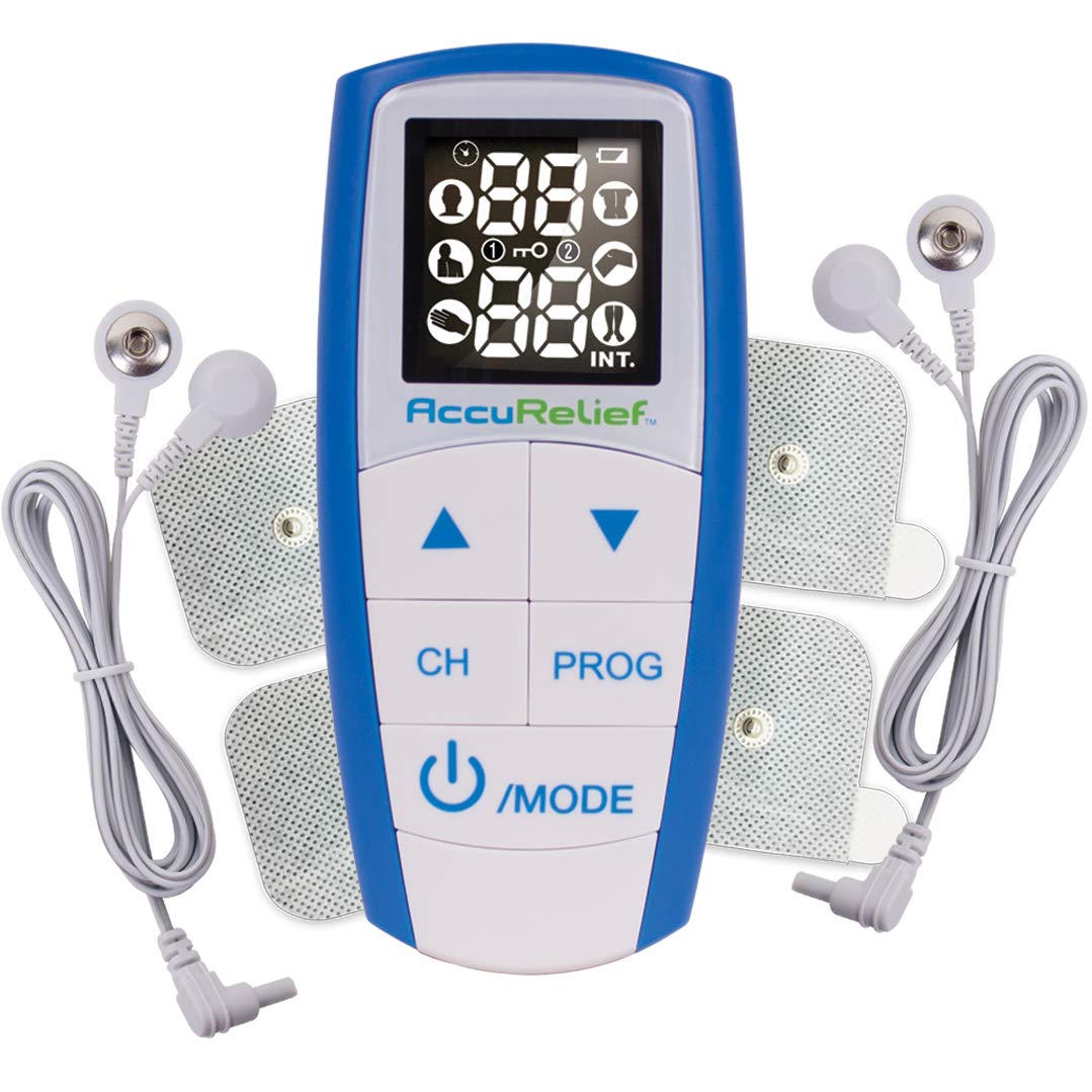 Details: AccuRelief 3-in-1 TENS, EMS, Massager Pain Management system For Natural, Drug-Free Pain Relief An over the counter solution that is clinically proven and recommended by doctors, physical therapists, and chiropractors. No prescription or doctor visit required. Get the pain relief or stimulation you are looking for - without ever having to take a pill or prescription drug again. Versatile, compact, and highly effective personal TENS, EMS, and massager unit perfect for work, home, or travel. What is TENS? TENS stand for Transcutaneous Electrical Nerve Stimulation and is a safe non-invasive way to block out pain signals to your brain. Stimulating pulses are sent through the surface of your skin that stimulate the nerves causing you pain. Encourages your body to release endorphins (natural painkiller). What is EMS? EMS stands for Electric Muscle Stimulator and works by contracting, activating and relaxing your muscles to speed up recovery, improve strength, blood circulation and overall endurance. Massager Setting Our 3-in-1 device also features a massage therapy mode for a more relaxing and enjoyable massage. Reduce your muscle tension with our 3 massage like modes: tap, knead, and rub. Features: 25 levels of intensity 6 preset programs with 6 customizable programs to choose the type of relief you want Use with 2 or 4 wired electrodes Easy to read LED screen Safe for all users How To Use: It's simple! Connect the supplied device and electrodes to one another, place the electrodes on your skin and you’re ready for TENS, EMS, or massage therapy by AccuRelief! The included Quick Start and Electrode Placement guides make the AccuRelief 3-in-1 Pain Relief System quick, safe, and easy for all users.