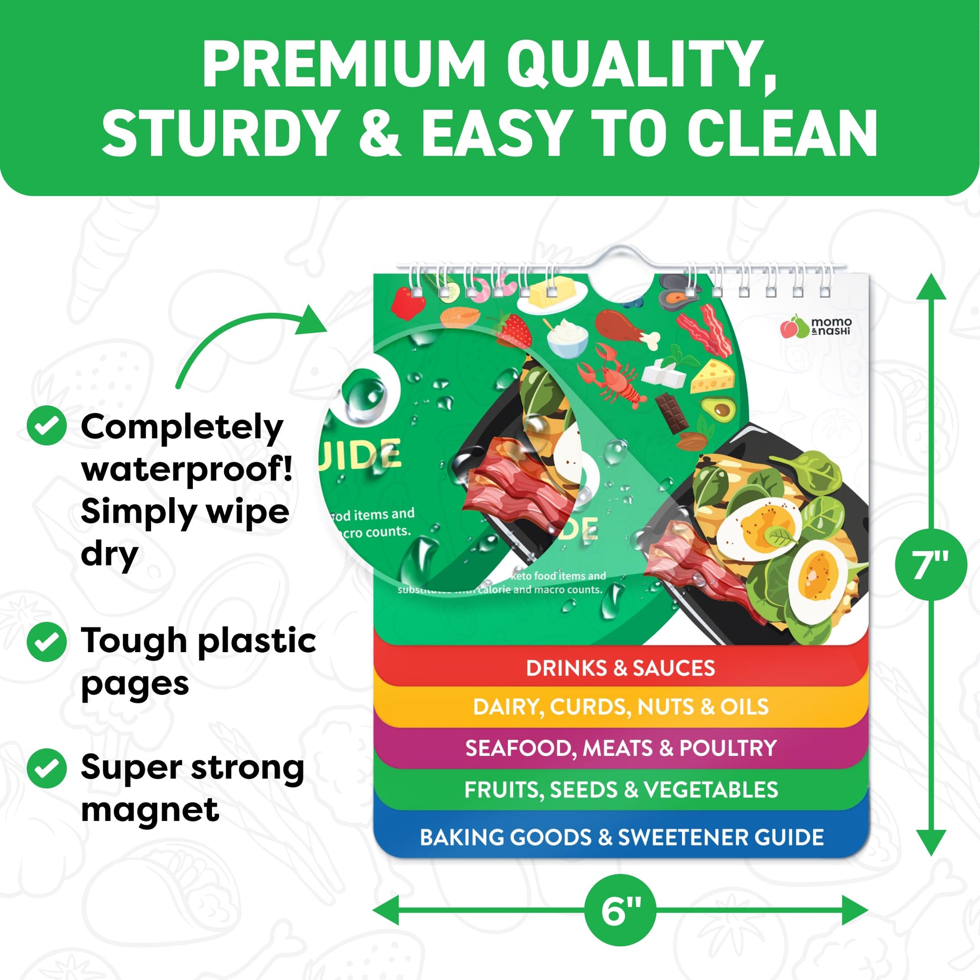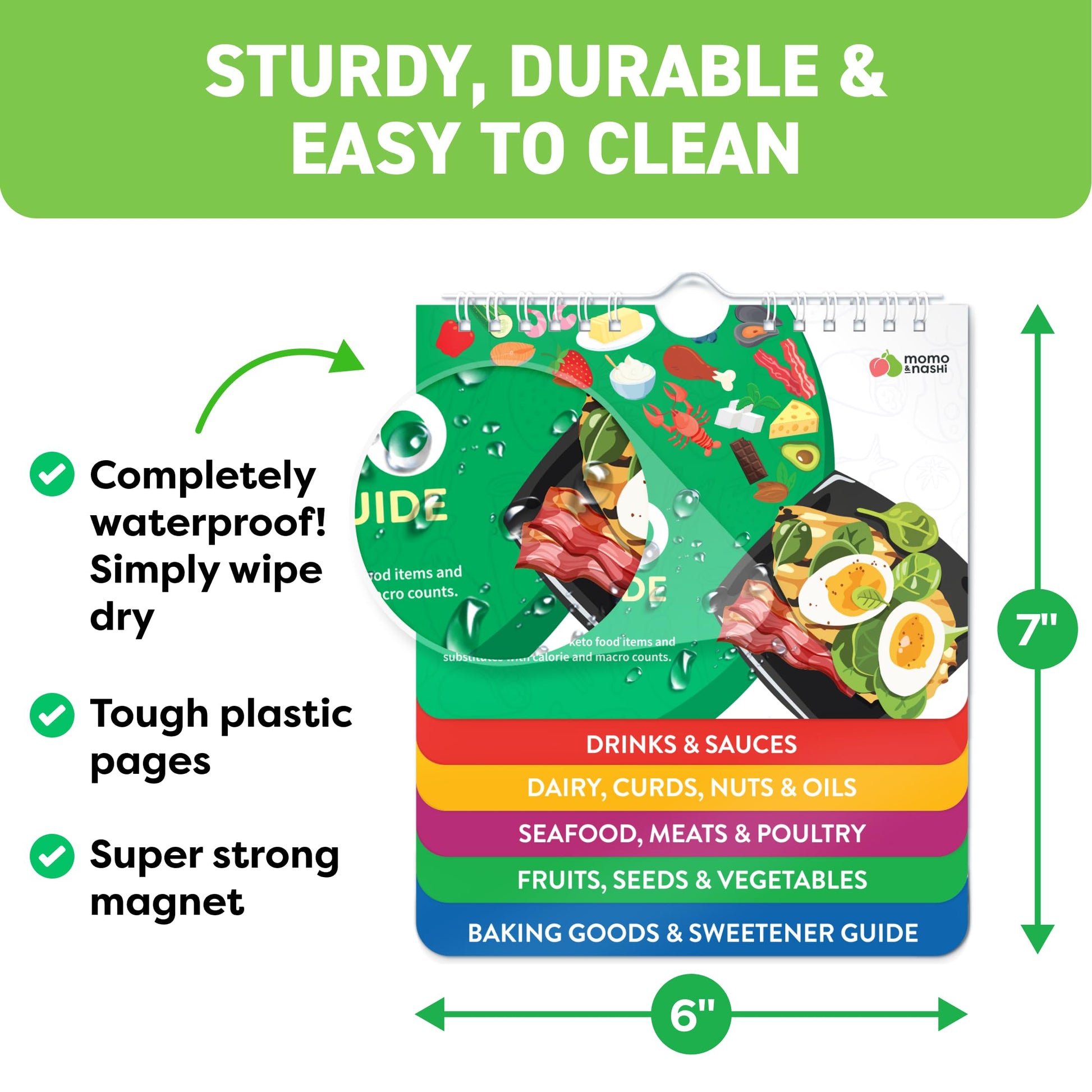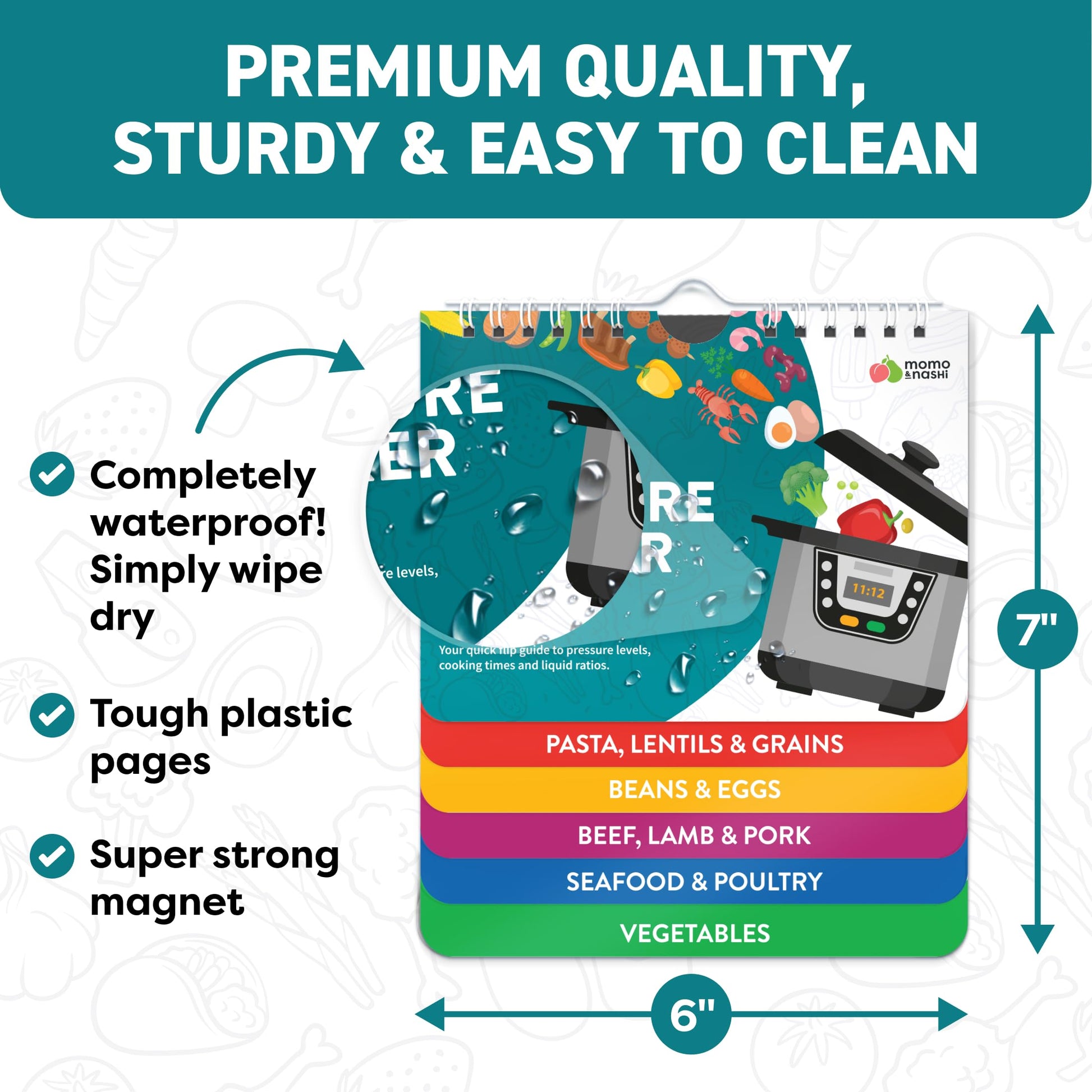 • Waterproof, Tear-Proof, and Easy to Clean. Durable air fryer cooking guide flip chart includes a hook for hanging and a large magnet for attaching to your fridge. These essential air fryer accessories function as both a reference and cooking chart. Perfectly sized at 7' x 6', it looks good in both big and small kitchens, RVs, or apartments while providing quick access to accurate air frying times and tips.