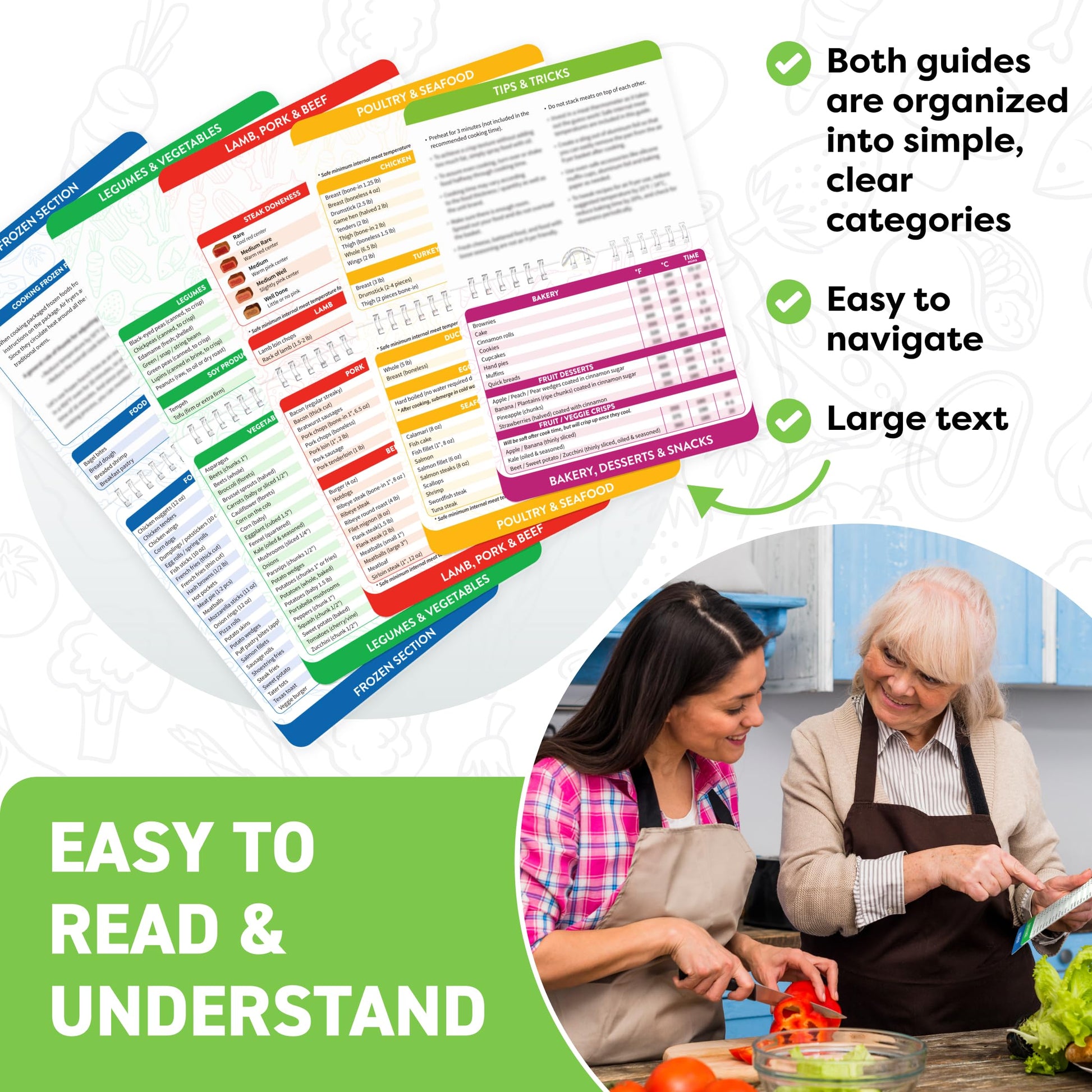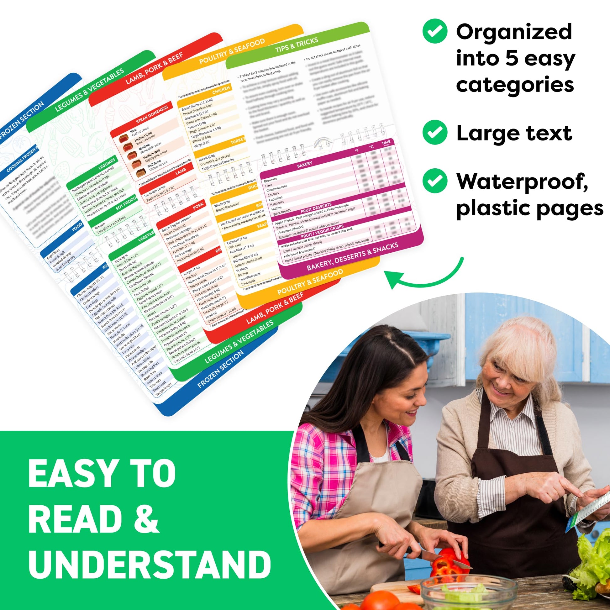 • Air Fryer Cookbook for Beginners and Experts with Color-Coded Tabs, Bold Fonts, and Both Celsius & Fahrenheit Readings. Designed for real kitchens, this handy cooking gifts booklet helps eliminate guesswork and improves cooking accuracy with clear magnetic cheat sheet instructions. Whether you're a busy parent or prepping healthy meals, this kitchen gadget simplifies air fryer use and makes an ideal gift-worthy kitchen must have 2025 and 2026.
