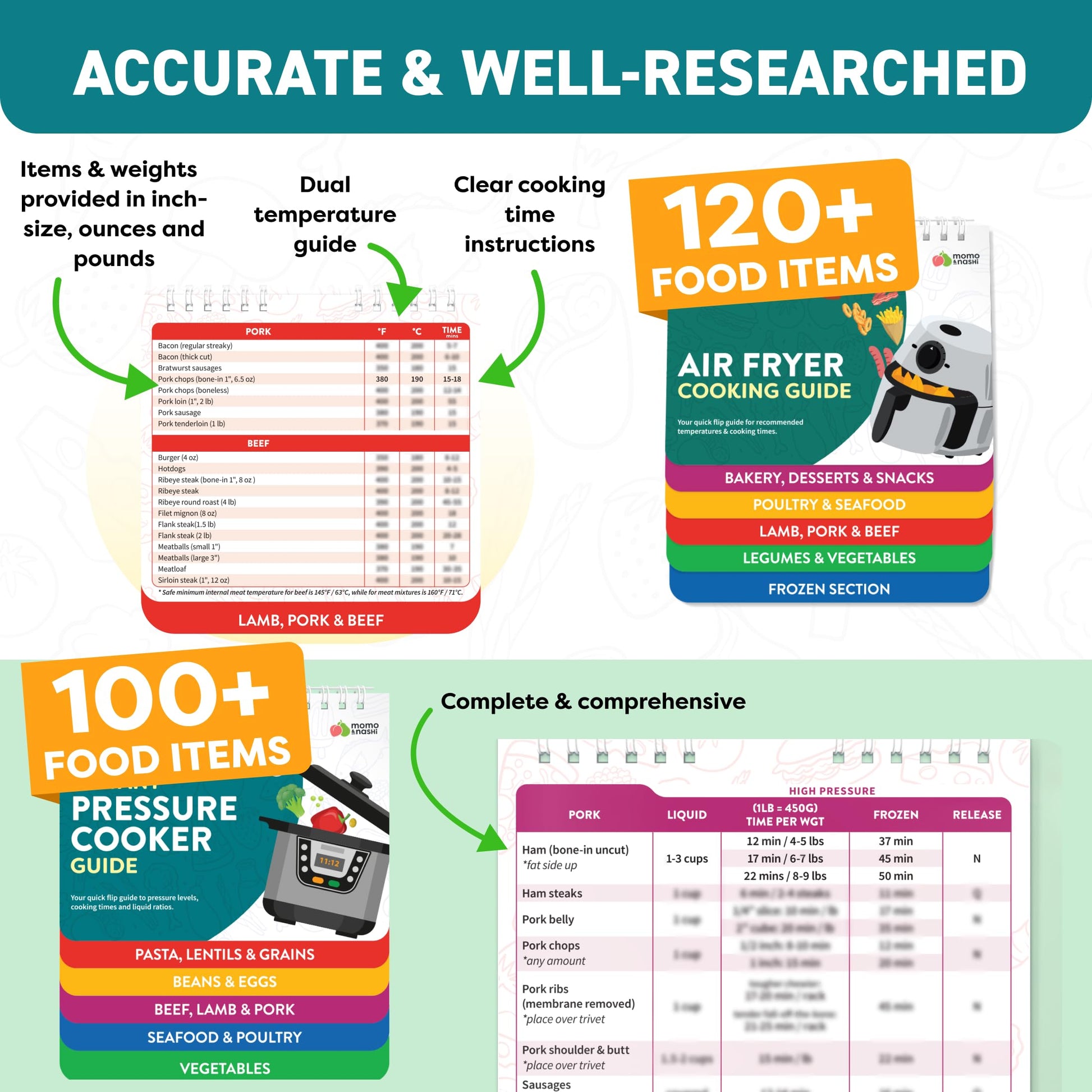 • Master Air Frying with All-in-One Air Fryer Cookbook Guide. Featuring 120+ foods across 5 helpful categories, this air fryer cheat sheet helps you quickly check cooking times and temperature reference for meats, vegetables, snacks, legumes, and frozen foods. Ideal kitchen gadget for beginners learning air fryer recipes and experienced cooks looking for time-saving solutions during daily meal prep.