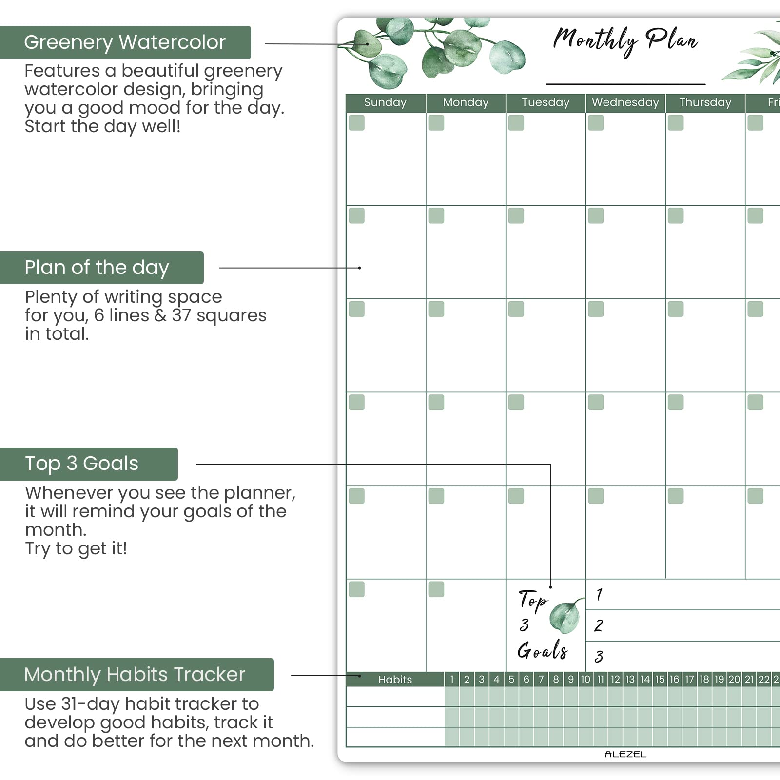 • Greenery Design: The design of the refrigerator whiteboard adds green leaf elements. Leave the freshness at home! In addition, top 3 goals and habit track are added to the planner. Remind your goals of the month, and use habit tracker to develop good habits, it’s easy for you with the greenery fridge calendar.