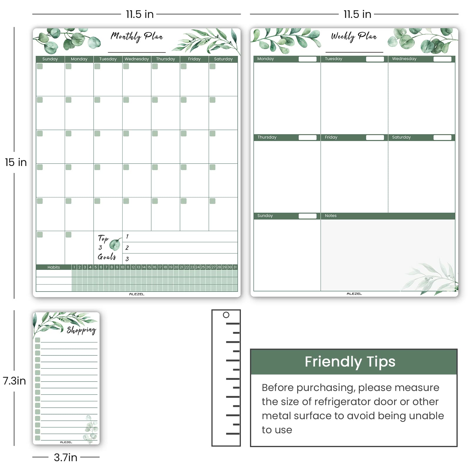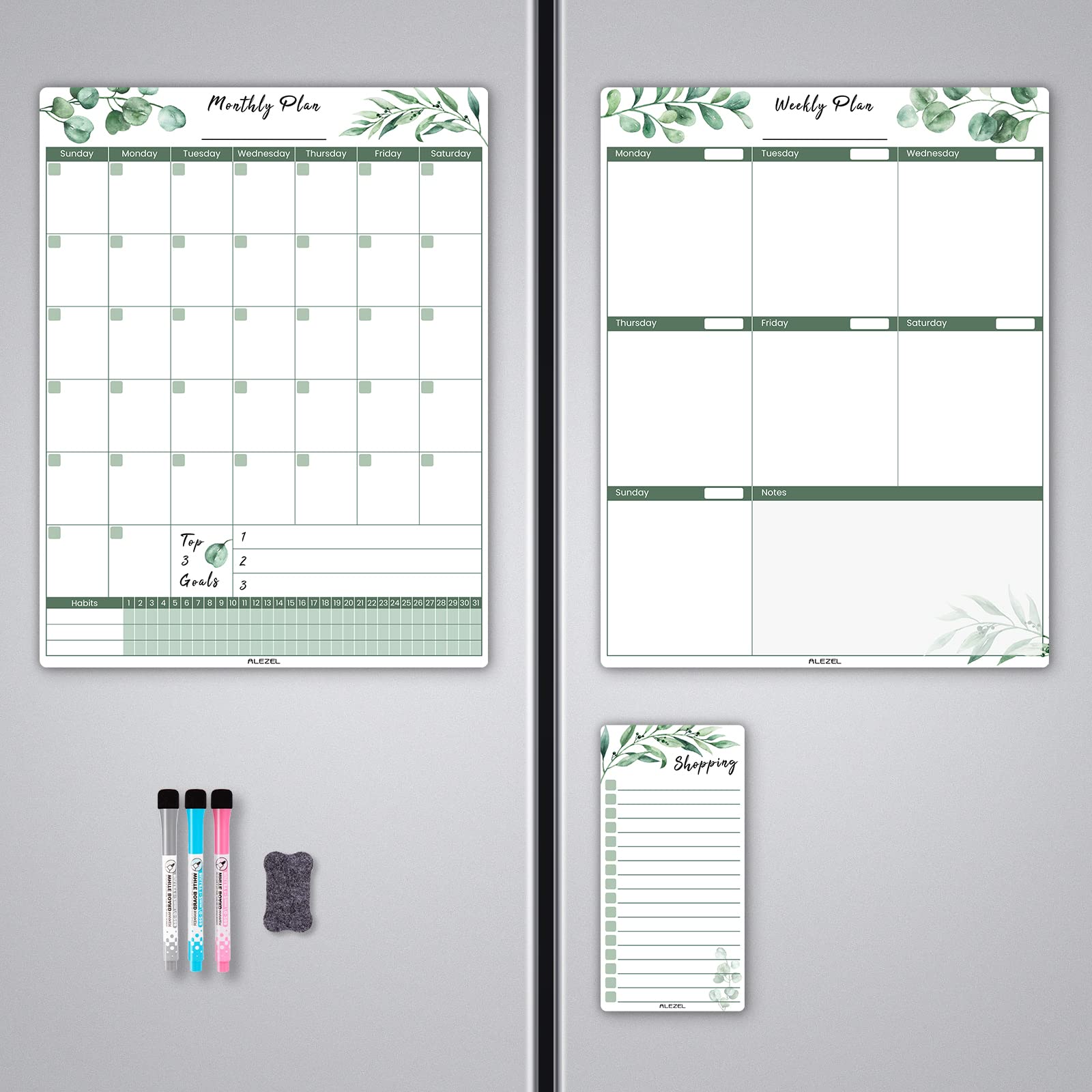 ALEZEL Magnetic Calendar for Refrigerator, Greenery Dry Erase Fridge Calendar Set (3 Boards) - Monthly & Weekly Planner Whiteboard, Shopping List White Board, 3 Markers + Eraser