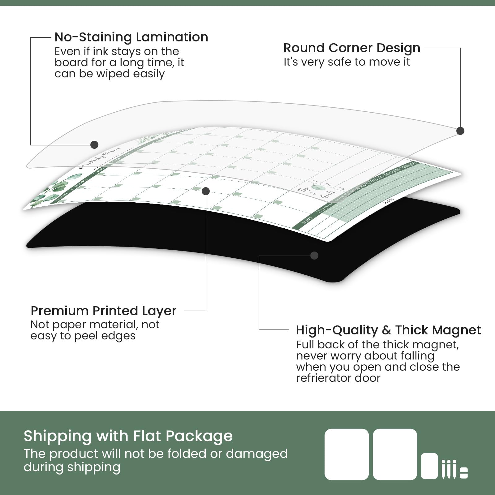 • Easy to Clean: Top layer film is made of premium PET. Even if ink stays on the board for a long time, it can be wiped easily. Don't worry about staining or ghosting, the monthly whiteboard will look new and glossy after multiple use.