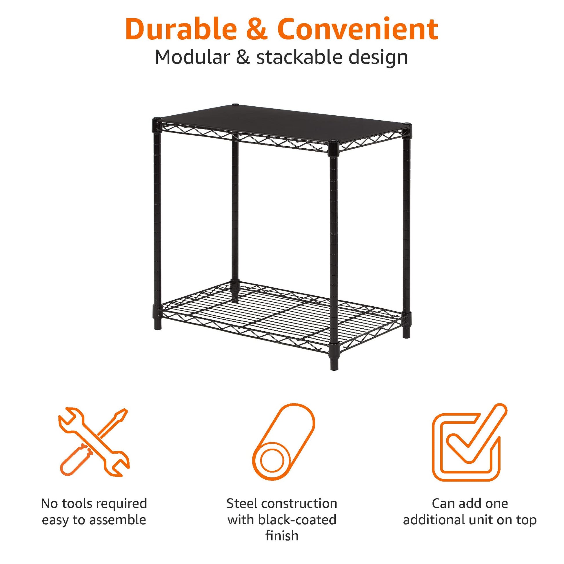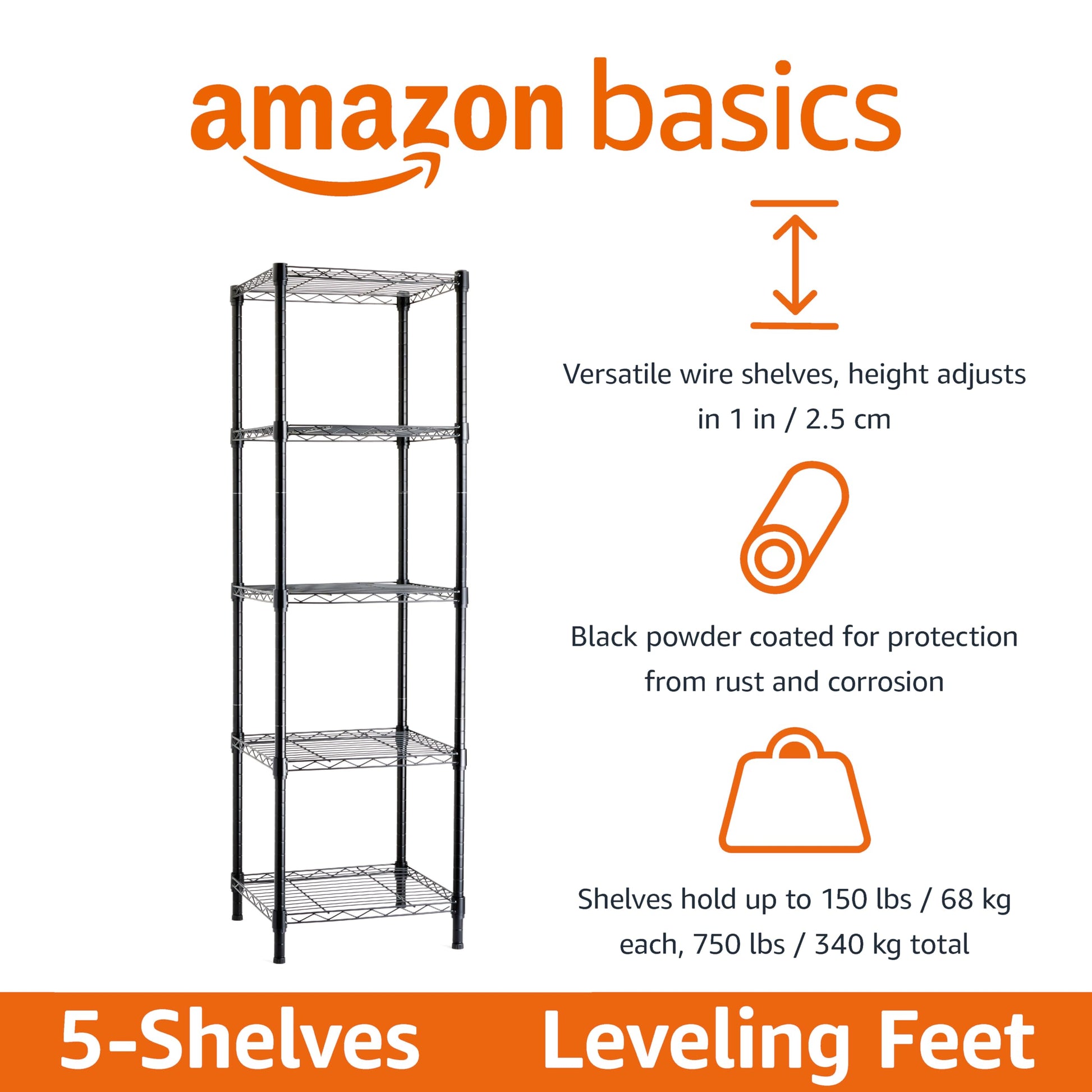 • Durable steel construction with a Black finish; each shelf holds up to 250 pounds, evenly distributed; 750 pound total weight capacity