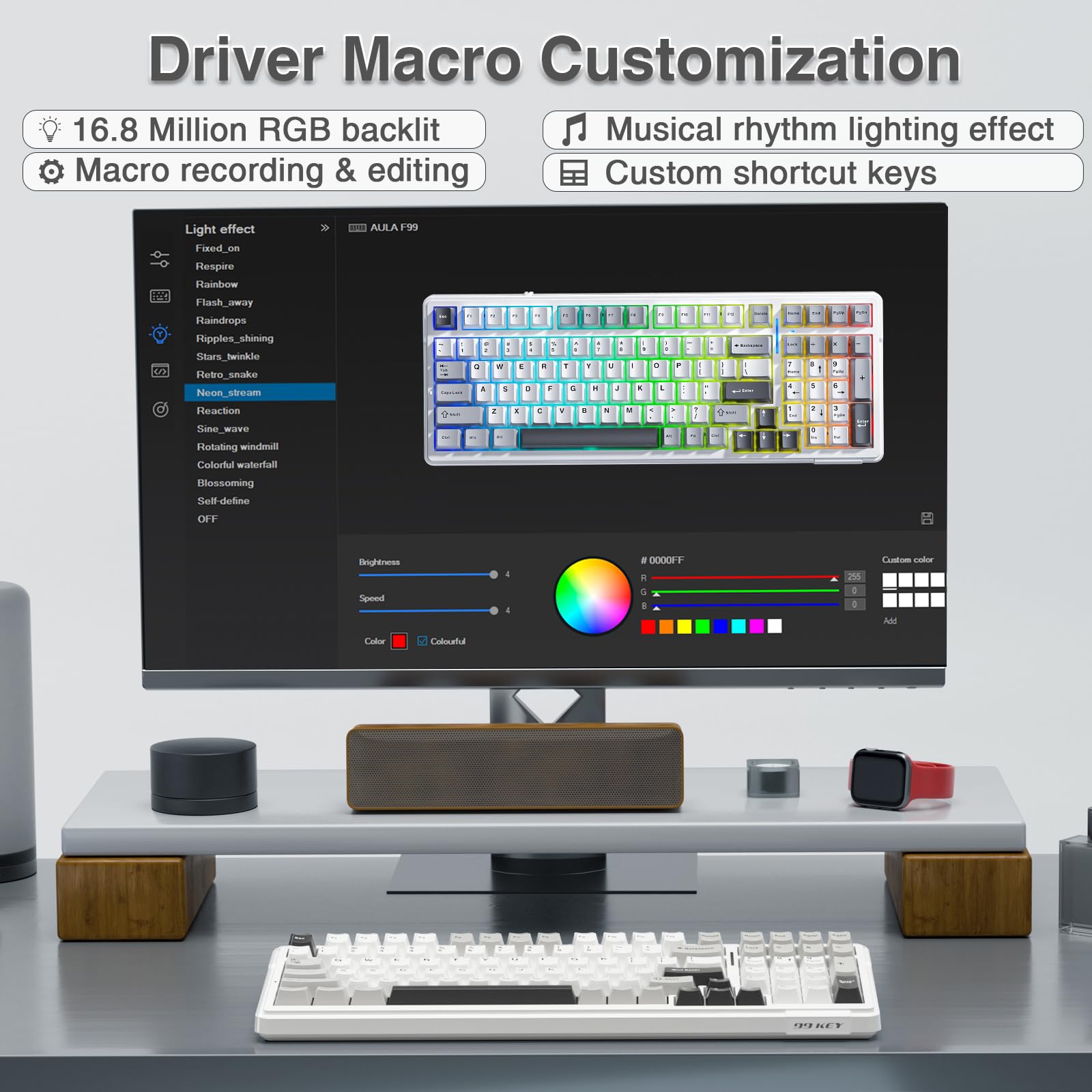 • Mechanical Gaming Keyboard: F99 is a premium mechanical keyboard for both work and game. With 16 RGB lighting effect to adds a great atmosphere to the game room. Keys support macro customization, which allows macro recording and editing, customize key function and 16.8 million light colors, and supports cool music rhythm lighting effects with driver. N-key rollover, keyboard can respond to multiple key presses at the same time, which is helpful in very exciting real-time games