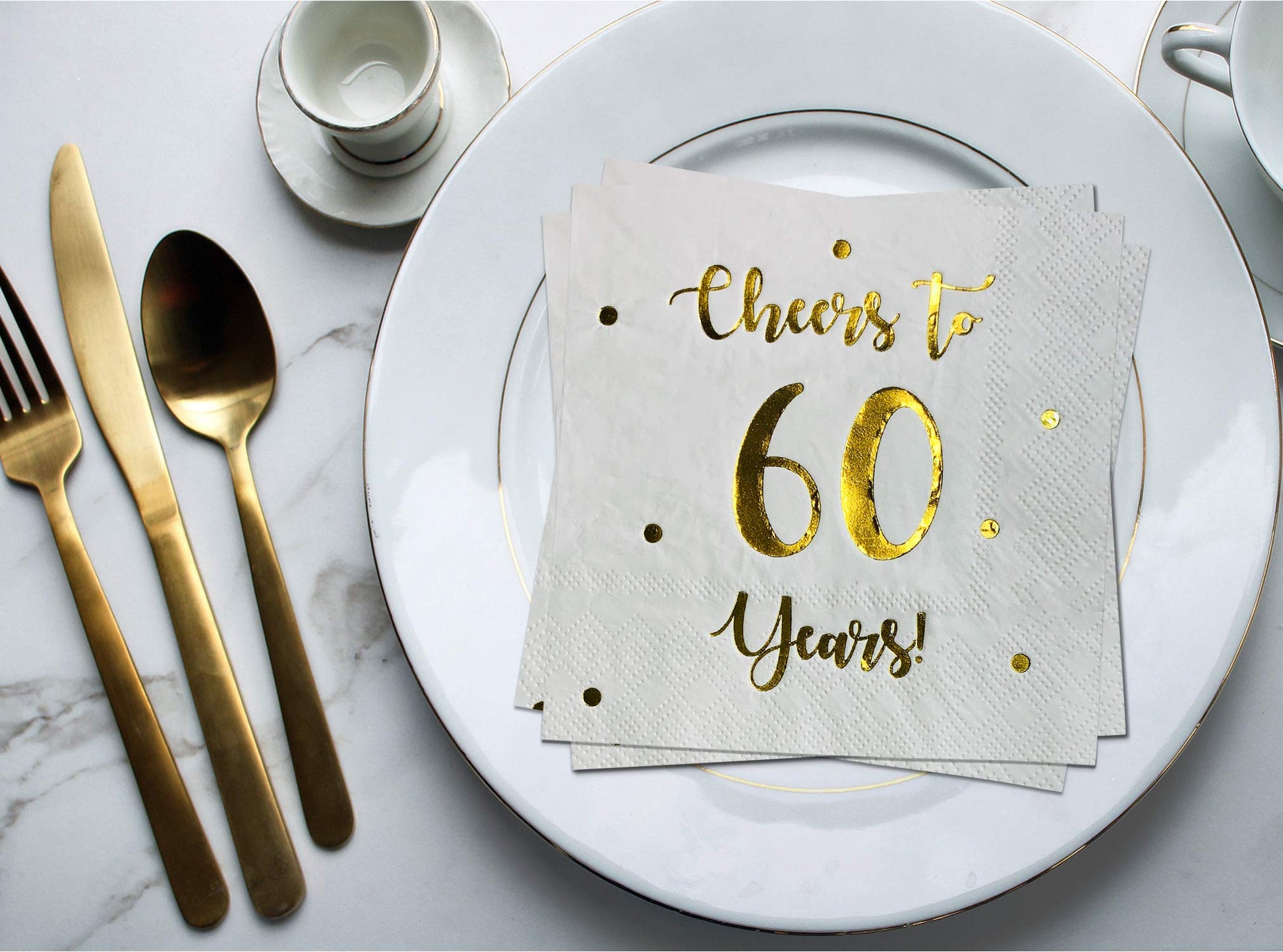 • SET INCLUDES: 50 premium quality white paper napkins with classic 'Cheers to 60 years' gold foil text and dots. 60 year celebrations happen once in a lifetime, celebrate them with good taste!