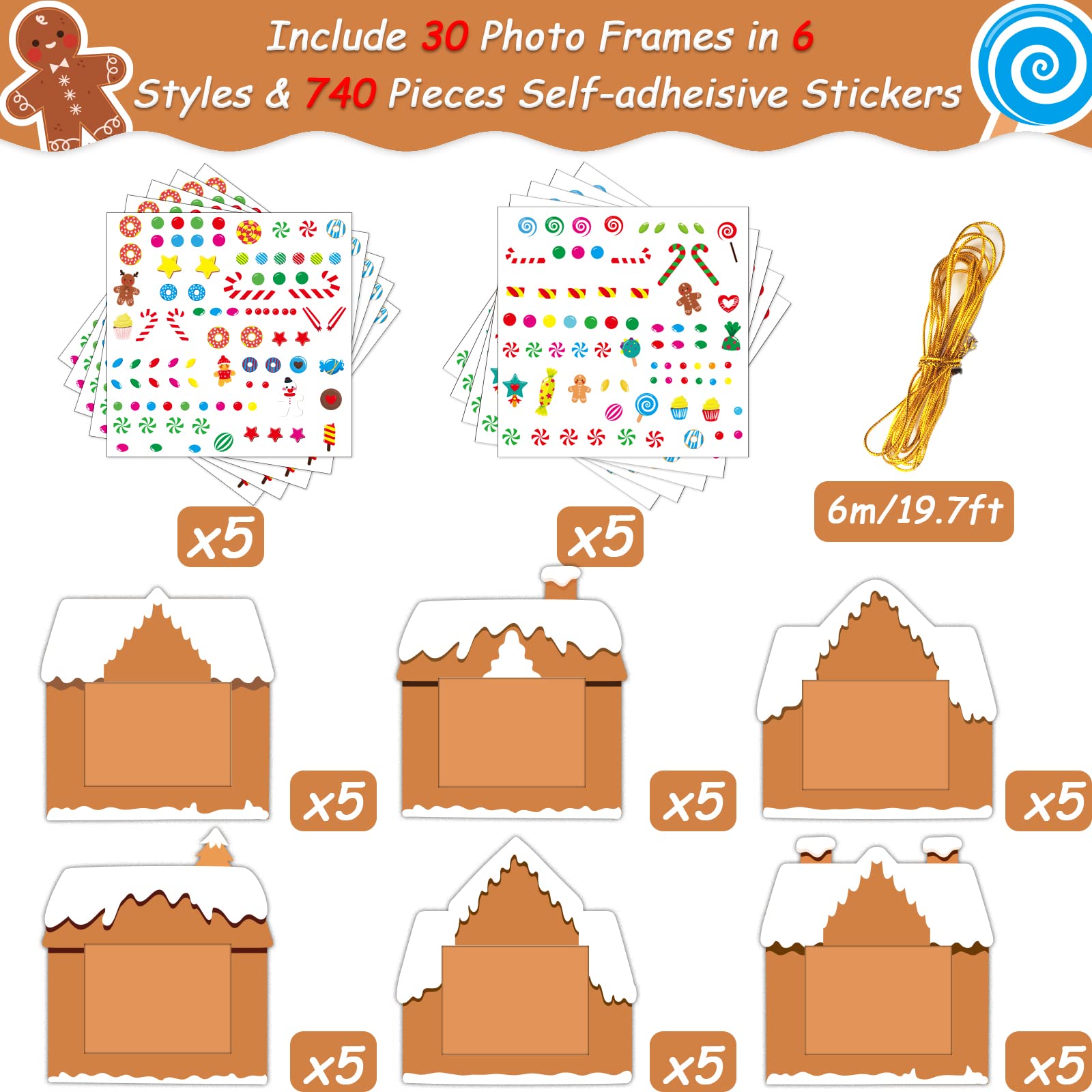 • 【Package Include】For each set, you will get 30 pieces Christmas gingerbread house picture frames designed in 3 different shapes; and the package comes with 10 sheets of self-adhesive stickers, over 300 pieces, they are enough for you to enjoy your DIY time!