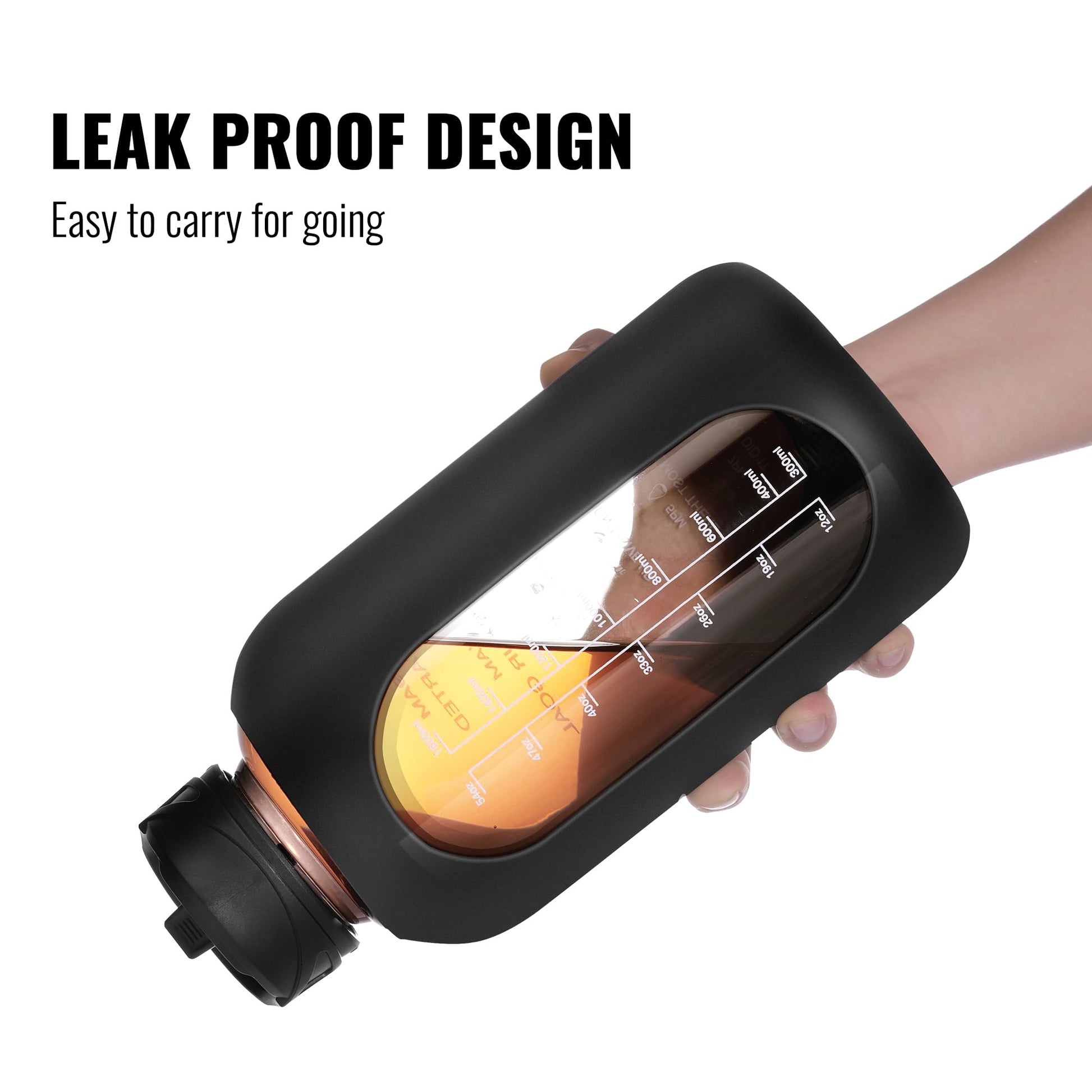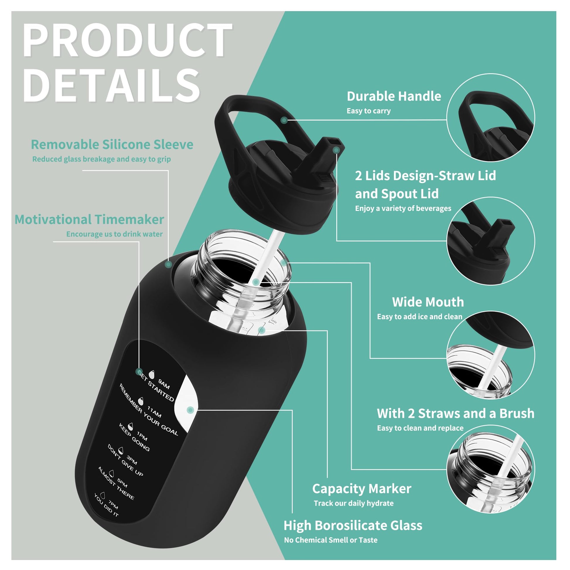 • HALF GALLON CAPACITY WATER BOTTLE: Large water bottle ensures you enjoy enough water without having to refill it frequently. It's perfect for an on-the-go lifestyle! 32 oz, 40oz, 64 oz capacity glass water bottles that meet your different hydrating need