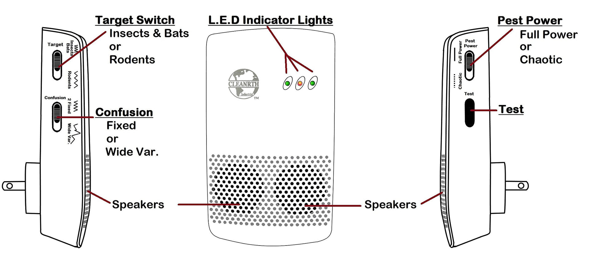 • 1) High Intensity Ultrasonic Pest Repelling Tech 2) Bat & Insect or Rodent Pest Targeting Switch