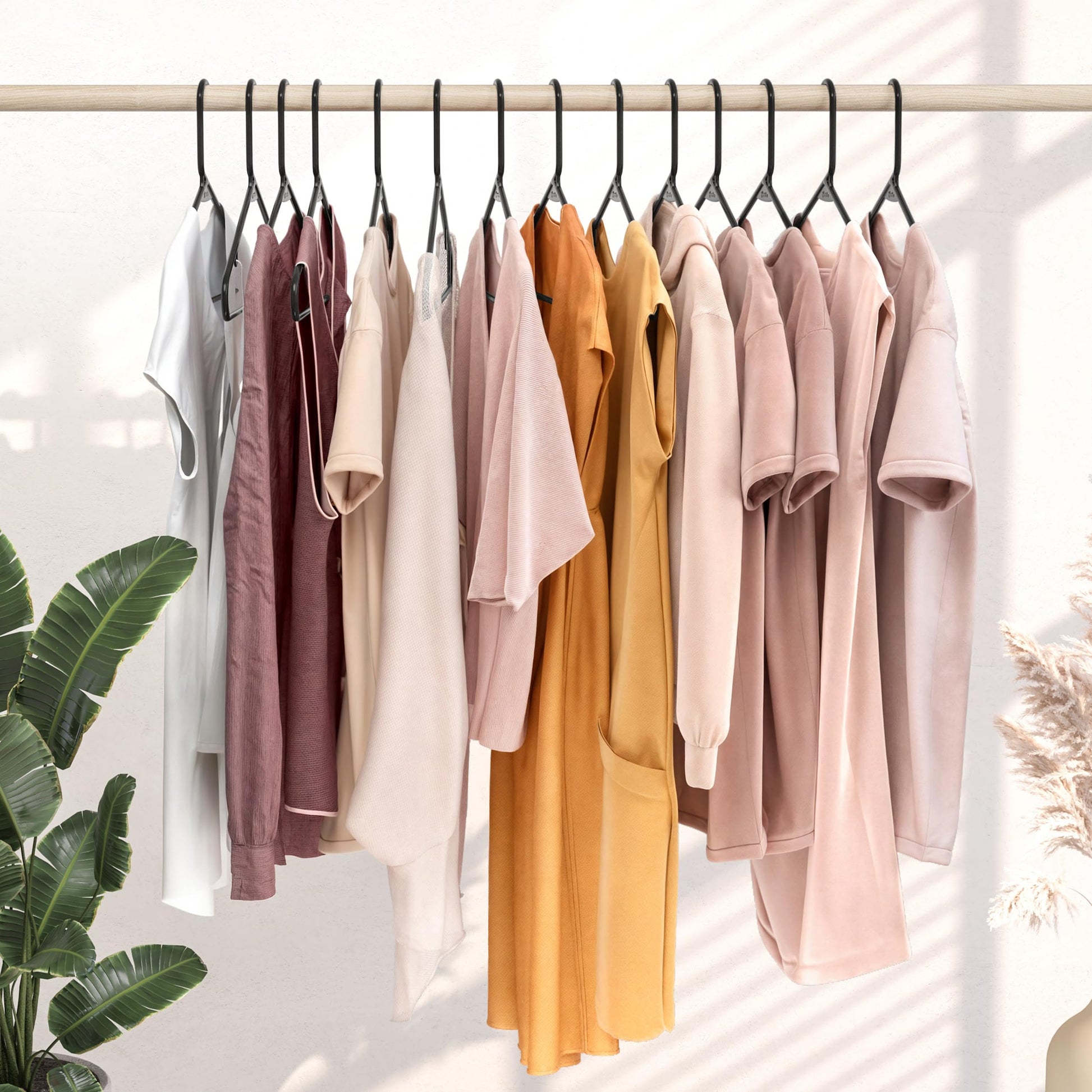 • MESS BE GONE! Organize and store tops, shirts, pants, skirts, dresses, suits, shawls, coats and more with these ideal black hangers. Maximize on space due to their slim, space saving design and enjoy the clean, calming effect on your closets. Say goodbye to that tangled clutter of hangers in every size and shape! Percheros Para Colgar Ropa