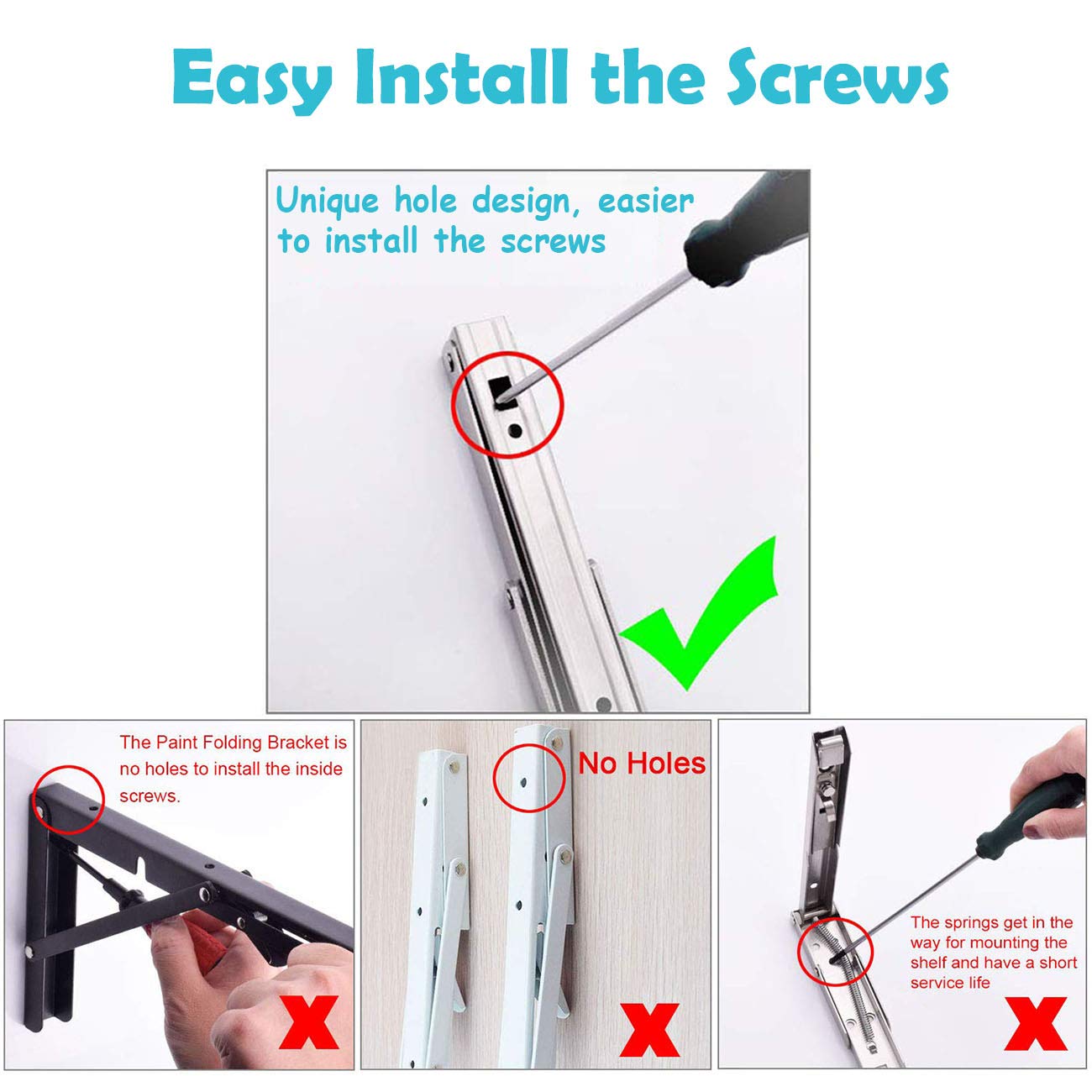 • No Paint, More Durable - The folding shelf brackets are constructed of Type premium grade stainless steel, no paint off, more durable. Surface brushed treatment, build to resist daily scratches, corrosion and tarnishing. Throw away your paint shedding brackets