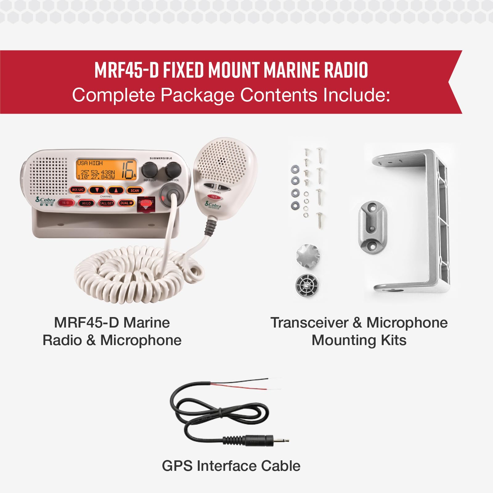 Details: View larger View larger Cobra Electronics MR F45-D Class-D Fixed Mount VHF Radio The Cobra MR F45 is a full function DSC-capable VHF radio. The selectable 1 or 25 Watt output is perfect for short or long-range communication. This unit has features usually reserved for more costly VHF radio units including Dual Watch, an adjustable backlight, and function keys on the mic. Includes The MR F45-D includes all of the core features of Cobra's fixed mount radios like; Noise canceling microphone, NOAA Weather Radio, Weather Alert, JIS7 Submersible, Instant channel 16/9, Scan, DSC call log, External speaker jack, Illuminated LCD display, Signal strength meter, GPS input capability, etc. Compliant with the latest FCC specifications for Class-D VHF Radios. Features: Class D DSC (Digital Selective Calling) - Allows you to send a distress signal at the touch of a button or exchange position information with other boats or stations. 1 or 25 Watts - Dual output power for short and long communication. USA, Cananda & International Channels - Allows operation on any of the three different channel maps established for these areas. 10 NOAA Weather Channels - Instant access to national All Hazards and weather information, 24 hours a day. Weather Alert - Alerts with an audible tone and visual alarm if threatening weather is nearby. MR F45-D Features & Specs.