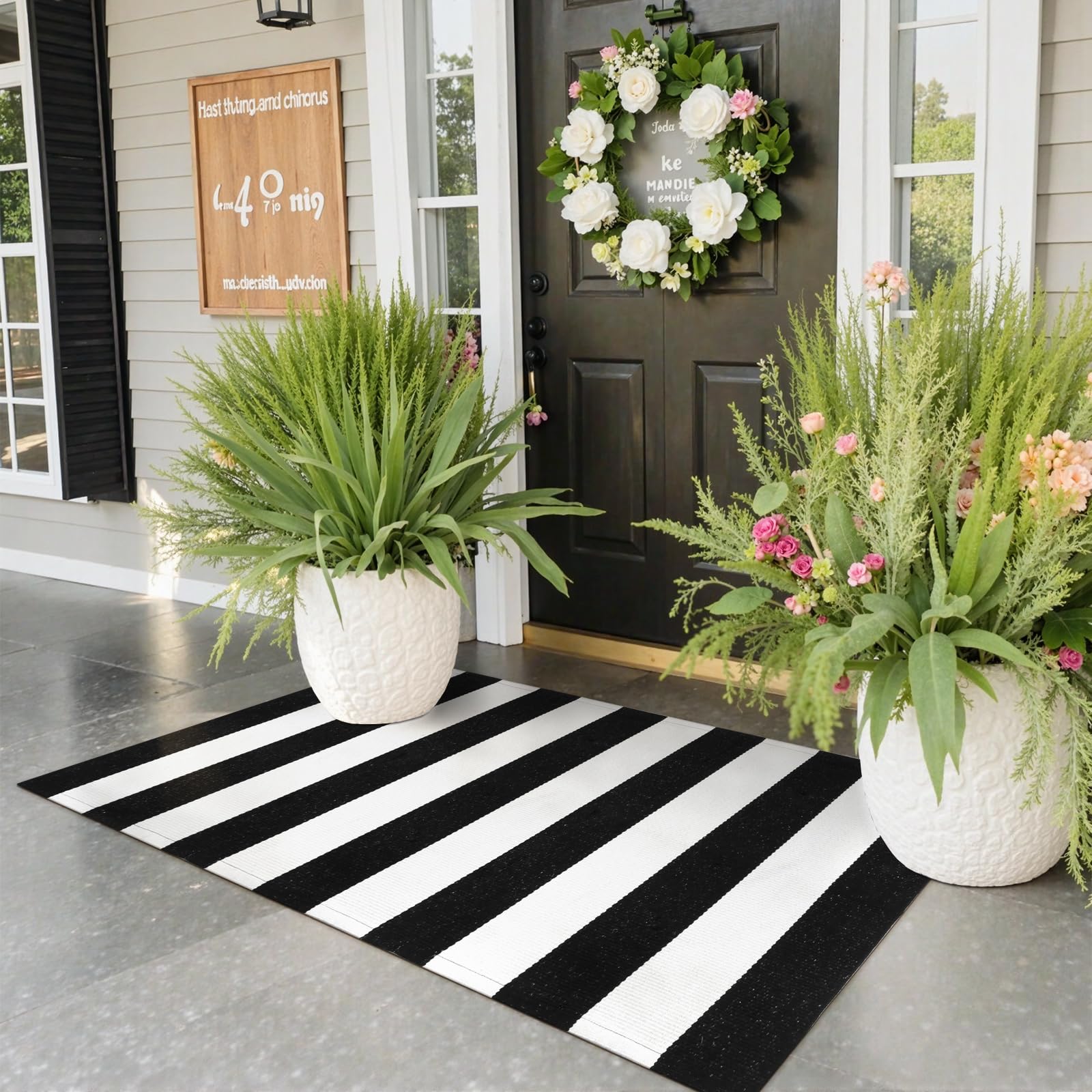 Collive Black and White Outdoor Striped Rug 24"x 51", Cotton Woven Fall Front Porch Rug Decor, Washable Farmhouse Layered Welcome Mat Outdoor for Kitchen Entryway Entrance Halloween