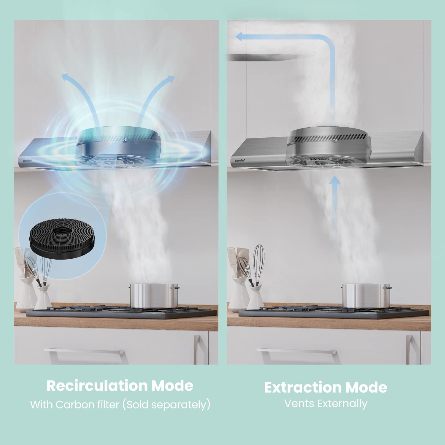 • Dual Installation Mode & Ideal Size: The stainless steel thin bodies and ideal sizes fit your cabinet perfectly and save space, and it can be installed in exhaustion mode and recirculation mode