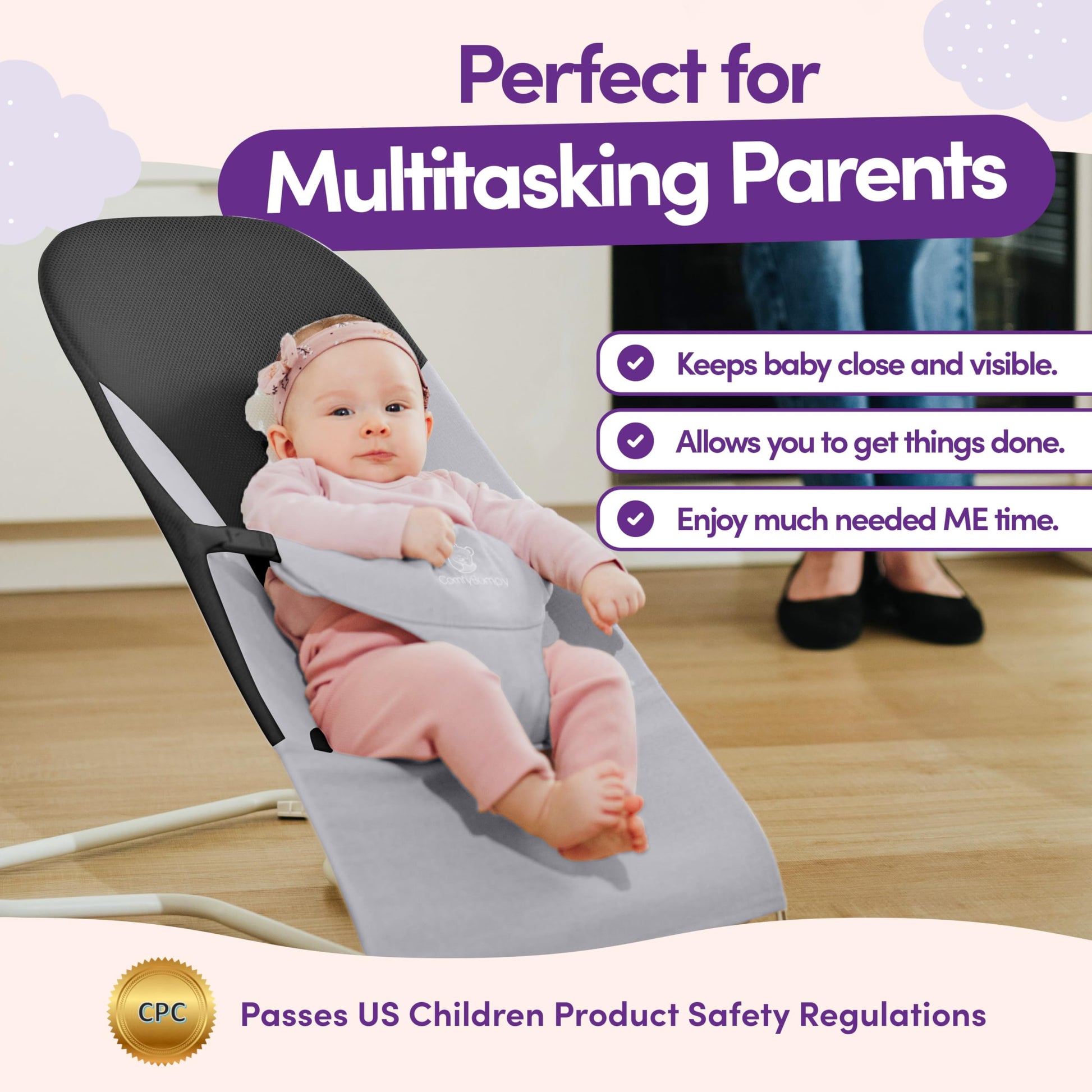 ComfyBumpy Ergonomic Baby Bouncer Seat - Bonus Travel Carry Case - Safe, Portable Bouncing Chair with Adjustable Height Positions - Infant Bouncy Seat Perfect for Newborn Babies (Grey)
