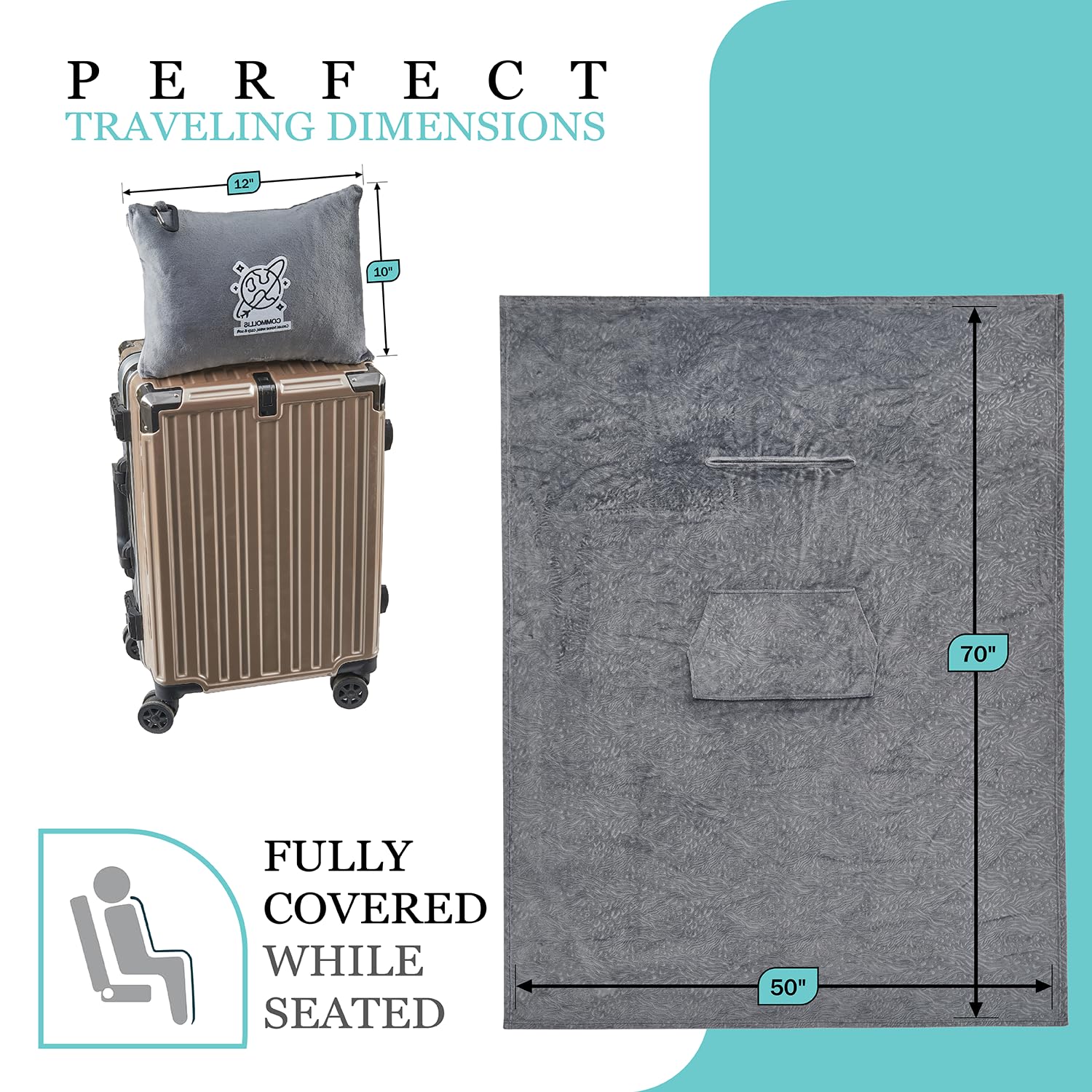 Commollis 2-in-1 Travel Blanket & Pillow for Airplane, Car, Train - Warm Compact Flight Blanket with Luggage Strap & Backpack Clip, Machine Washable, All-Season Use